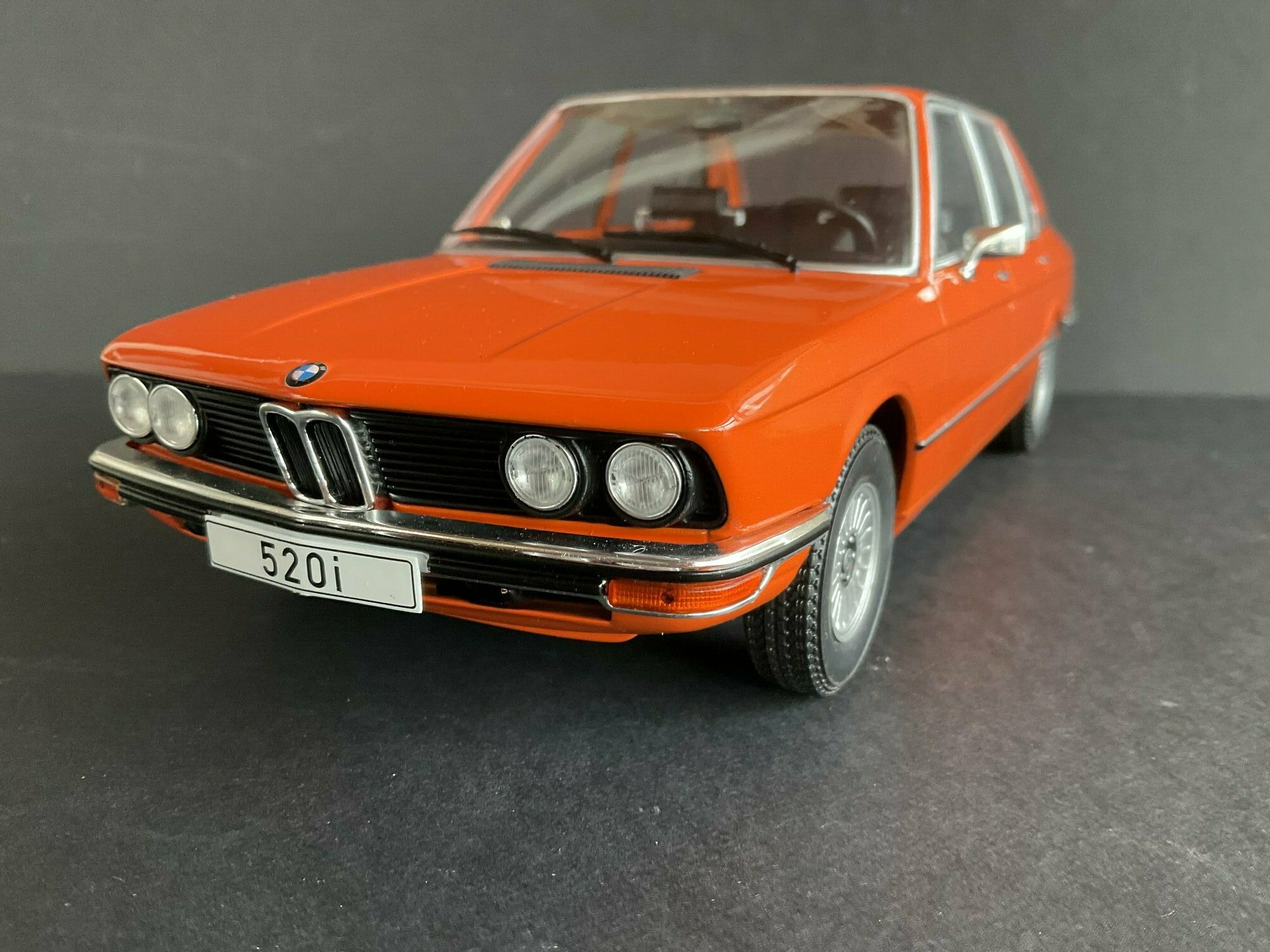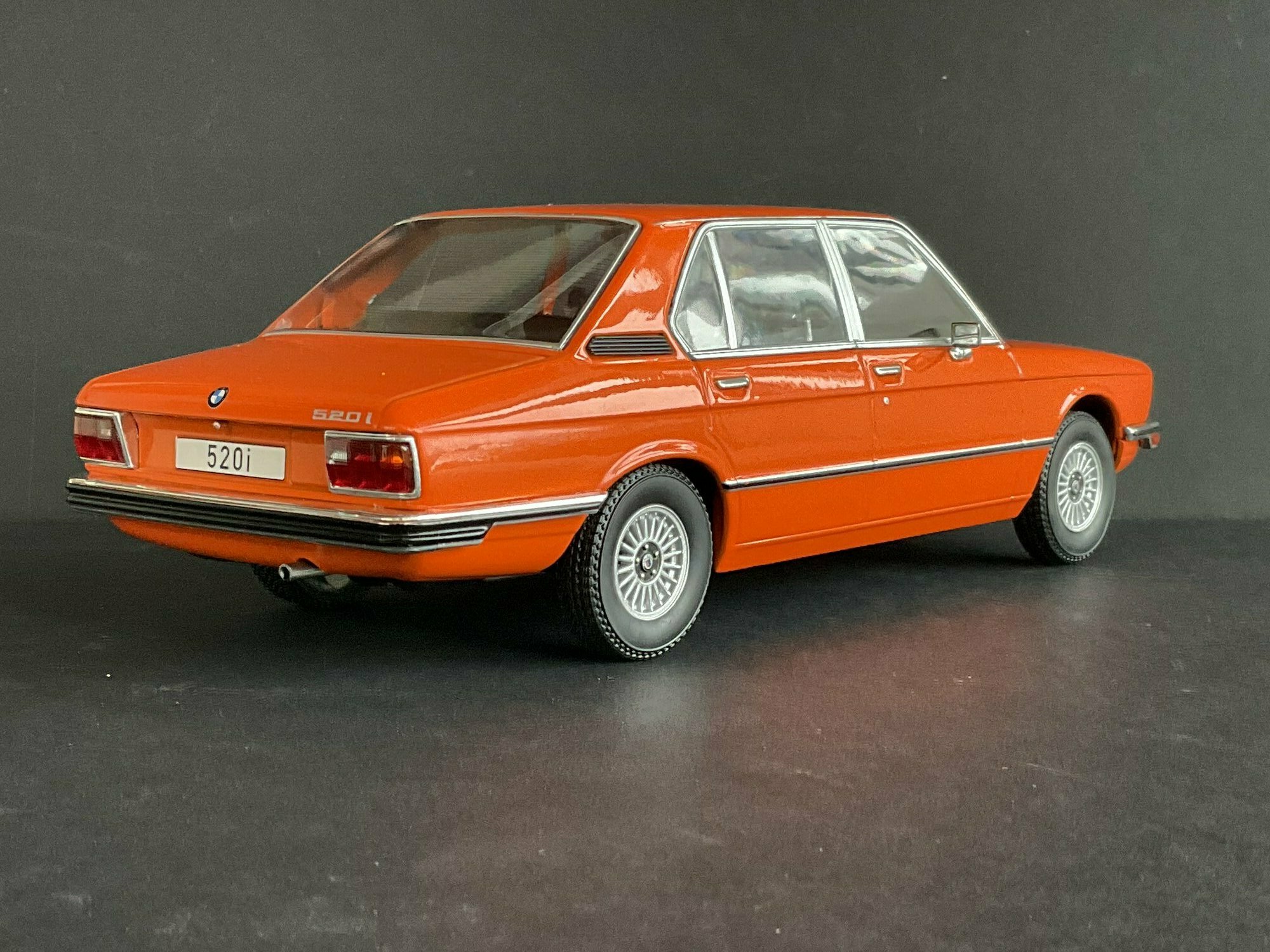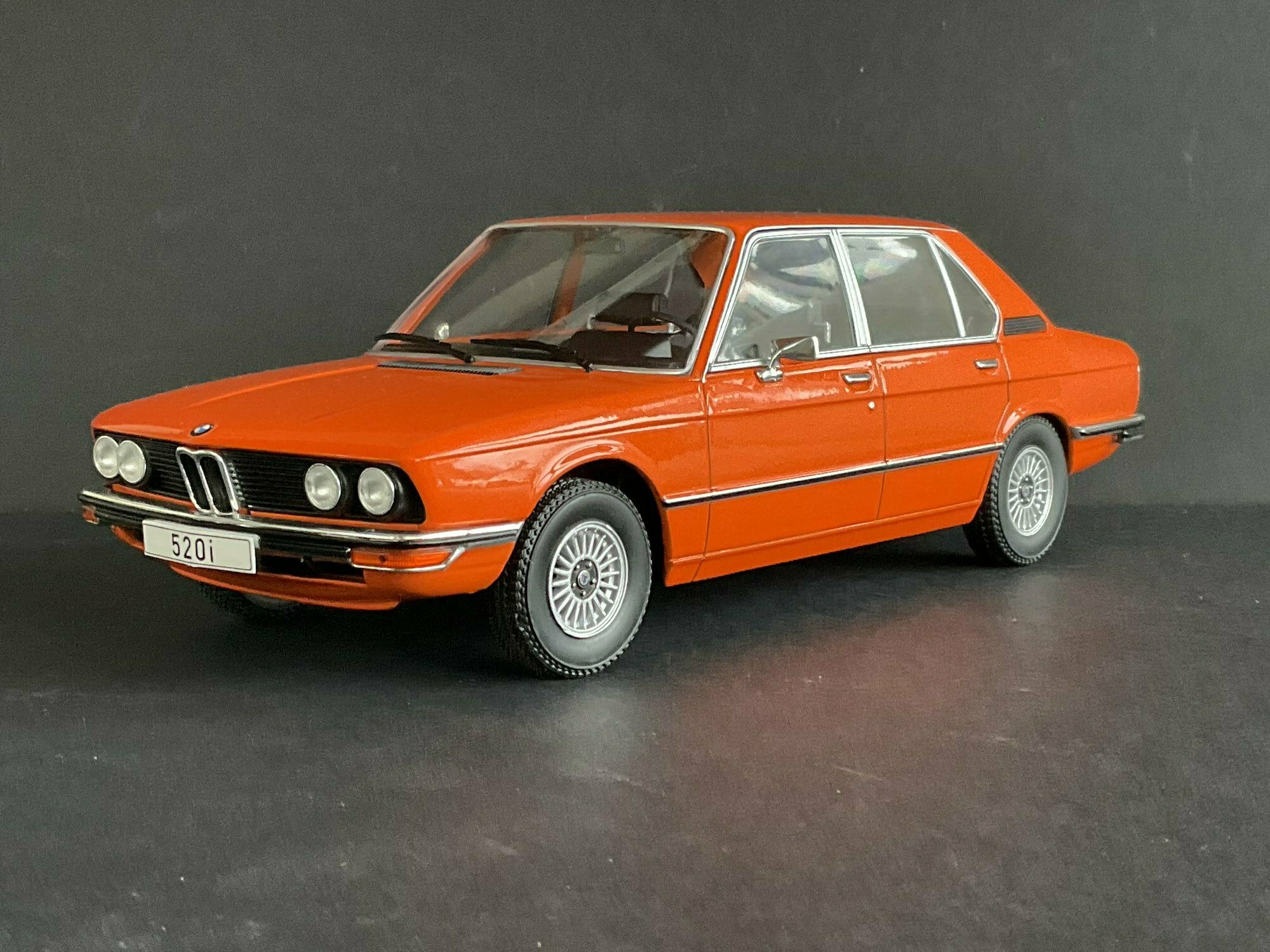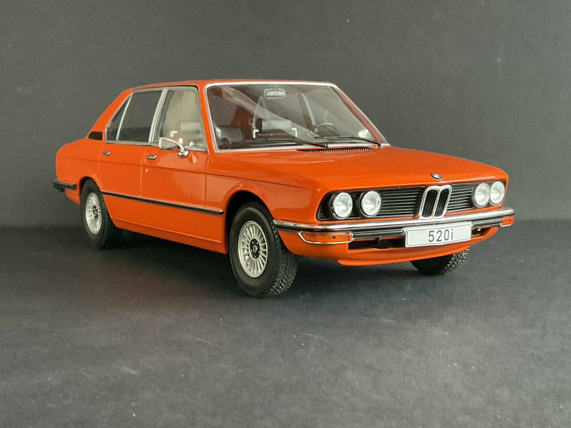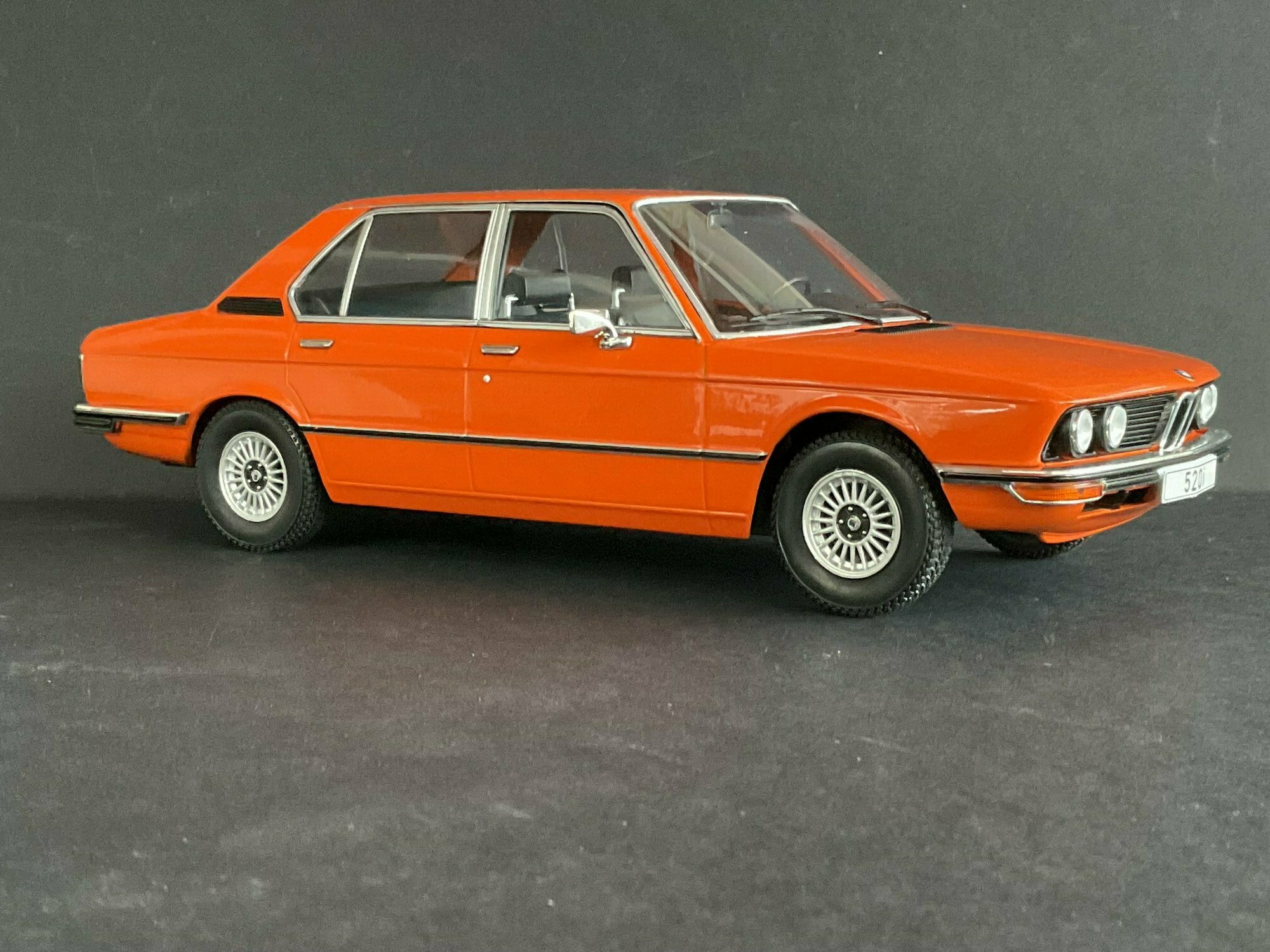 This model is made by MCG and is in 1/18 scale. It’s a die‑cast piece, so it’s sturdy and has a satisfying weight — and it captures the lines of the BMW 5er Limousine (E12) pretty well. The example belongs to the collector “TrolleyJack.” The paint is a strong orange that really fits the era — BMW offered a similar shade known as Inka‑Orange (color code 022). The photos show even gaps and correctly rendered trim along the flank and polished window surrounds. Up front you’ve got the twin round headlights with the black horizontal grille detail and the classic BMW kidney grille that defines the BMW 5er Limousine (E12). The bumpers are done as chrome strips with the hint of rubber inserts. At the rear you can spot the characteristic vent ahead of the C‑pillar, another E12 trait. The interior is in brown/earth tones, typical for the 1970s; the dash, three‑spoke wheel and center console are nicely represented. The multi‑spoke alloy wheels reference period‑correct BMW accessory rims; the front plate detail reading “520i” makes the intended derivative clear. Overall the die‑cast model gives the body’s proportions and edges a faithful feel, so the E12’s design language comes across well.