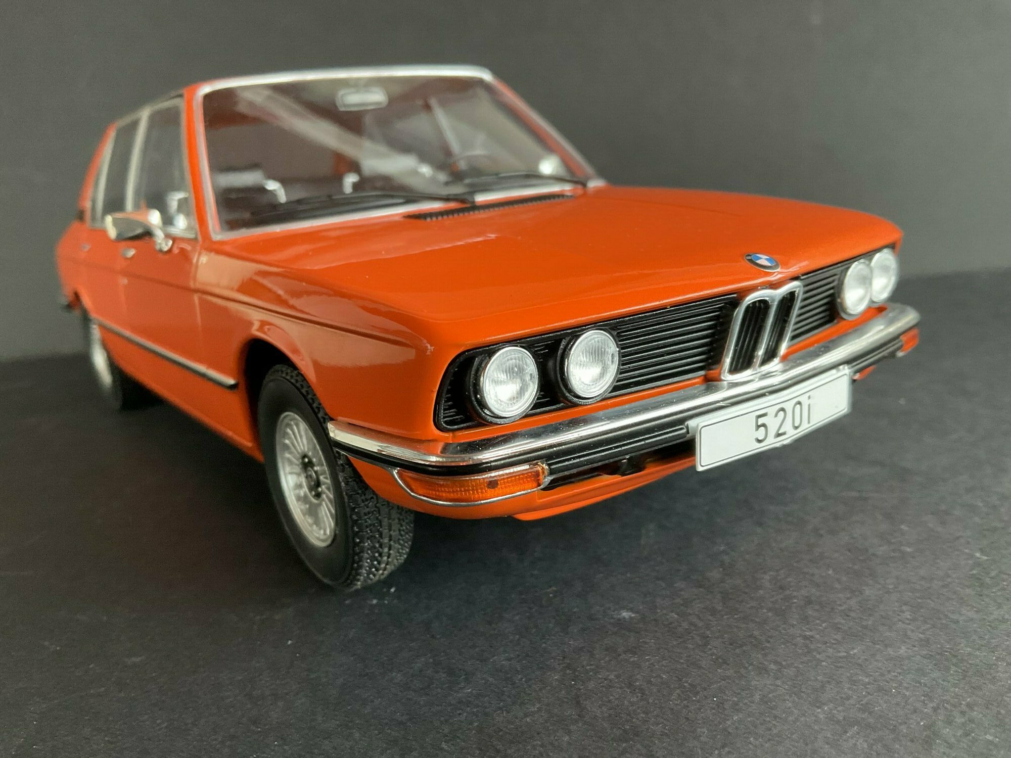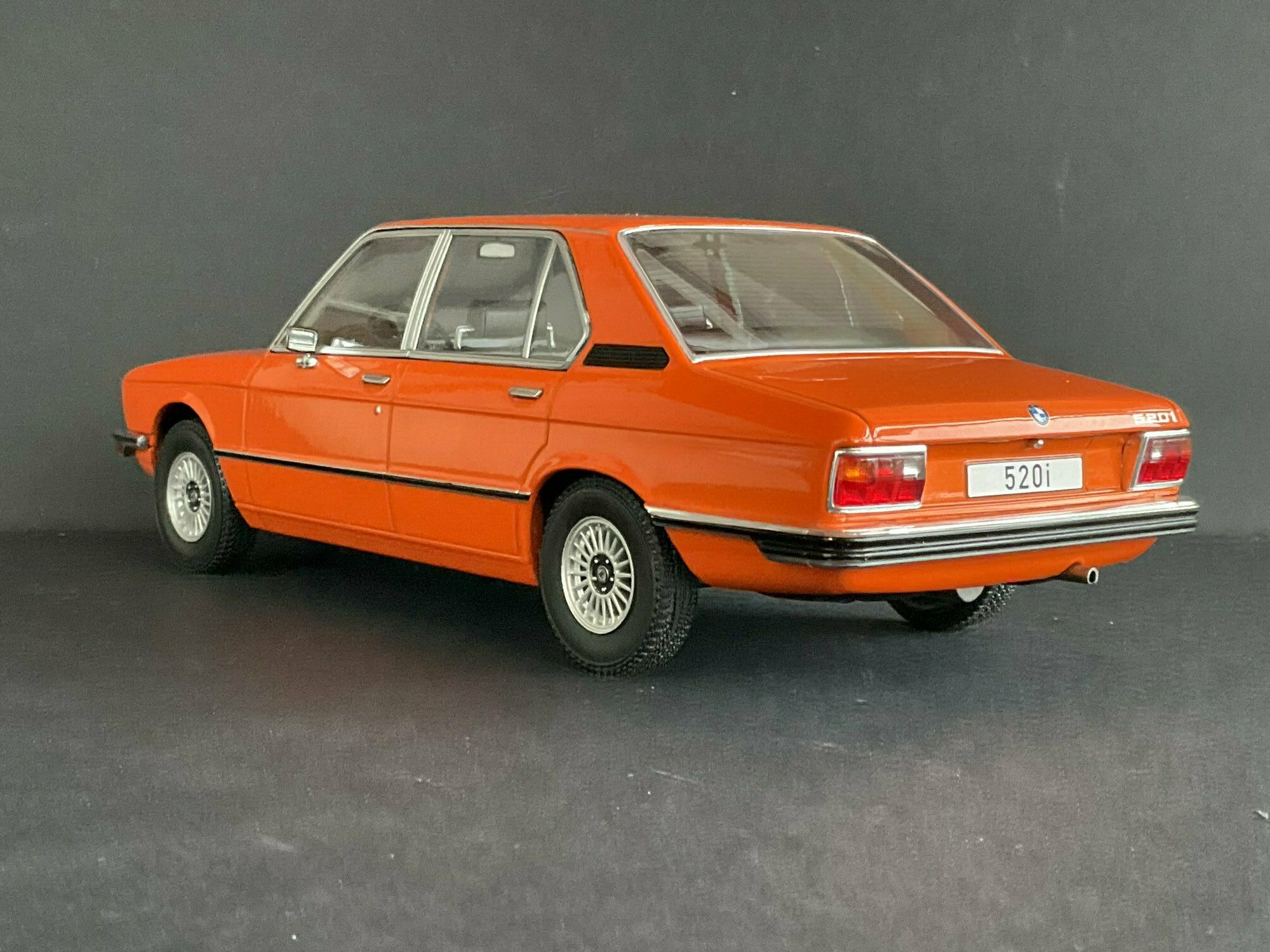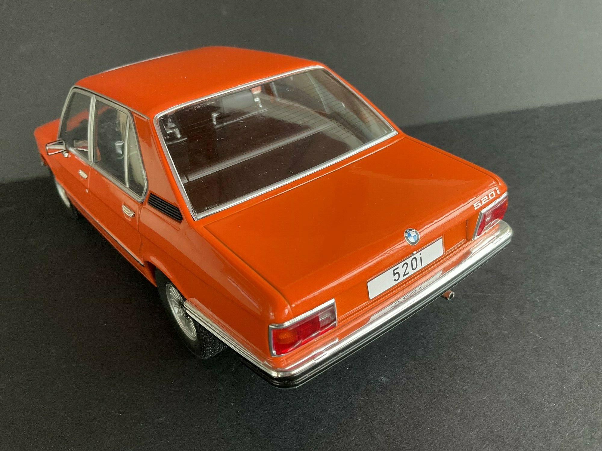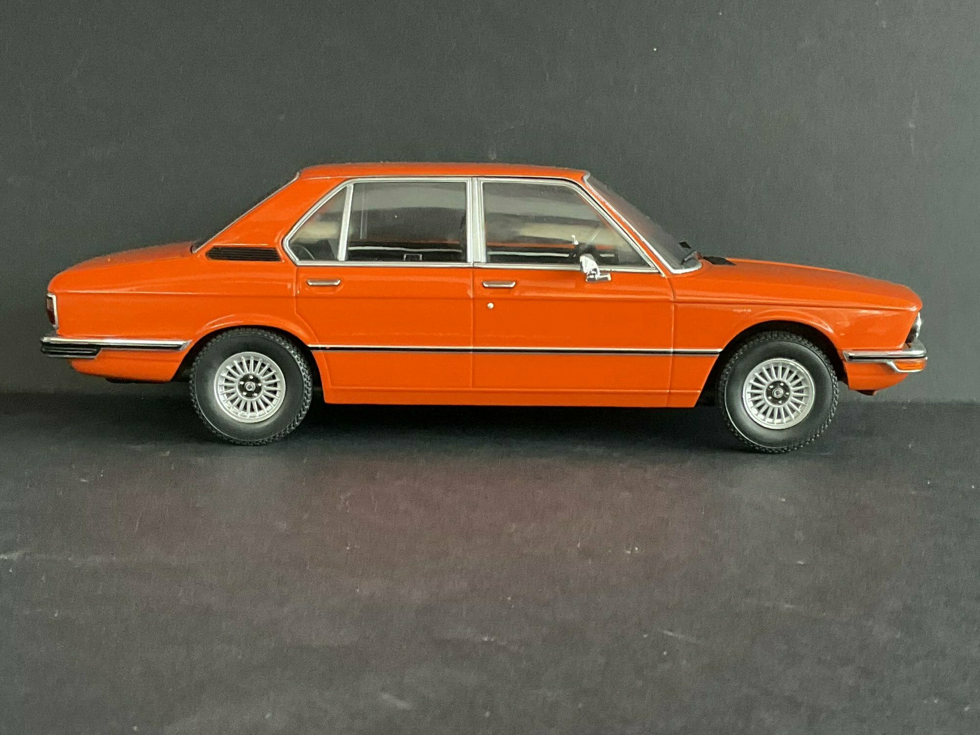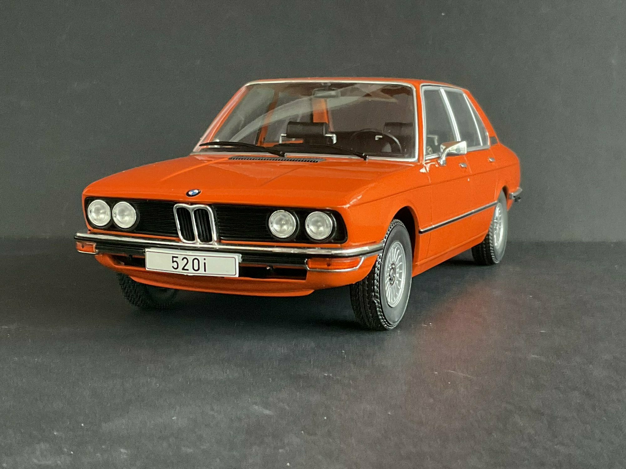 This model is made by MCG and is in 1/18 scale. It’s a die‑cast piece, so it’s sturdy and has a satisfying weight — and it captures the lines of the BMW 5er Limousine (E12) pretty well. The example belongs to the collector “TrolleyJack.” The paint is a strong orange that really fits the era — BMW offered a similar shade known as Inka‑Orange (color code 022). The photos show even gaps and correctly rendered trim along the flank and polished window surrounds. Up front you’ve got the twin round headlights with the black horizontal grille detail and the classic BMW kidney grille that defines the BMW 5er Limousine (E12). The bumpers are done as chrome strips with the hint of rubber inserts. At the rear you can spot the characteristic vent ahead of the C‑pillar, another E12 trait. The interior is in brown/earth tones, typical for the 1970s; the dash, three‑spoke wheel and center console are nicely represented. The multi‑spoke alloy wheels reference period‑correct BMW accessory rims; the front plate detail reading “520i” makes the intended derivative clear. Overall the die‑cast model gives the body’s proportions and edges a faithful feel, so the E12’s design language comes across well.