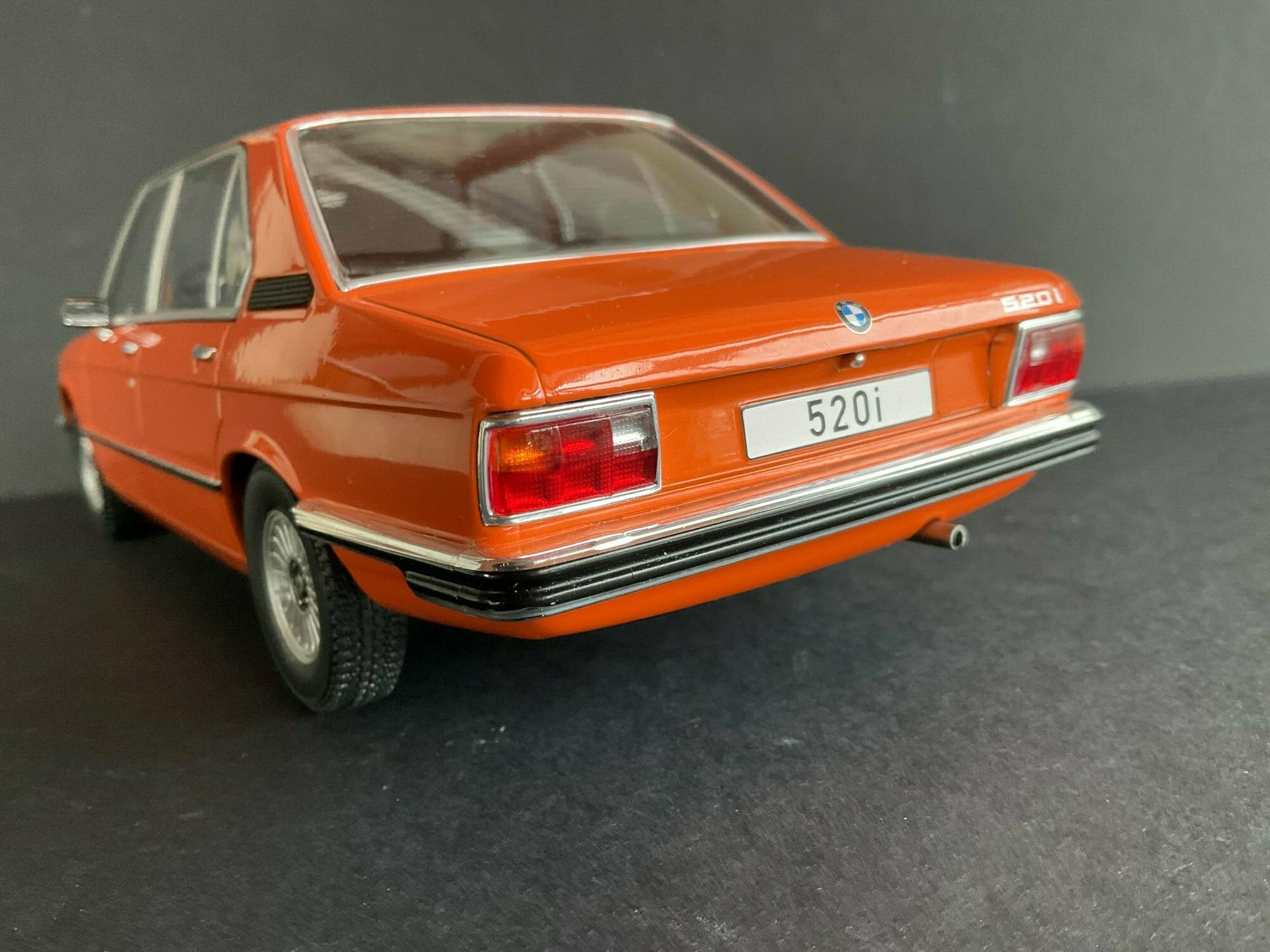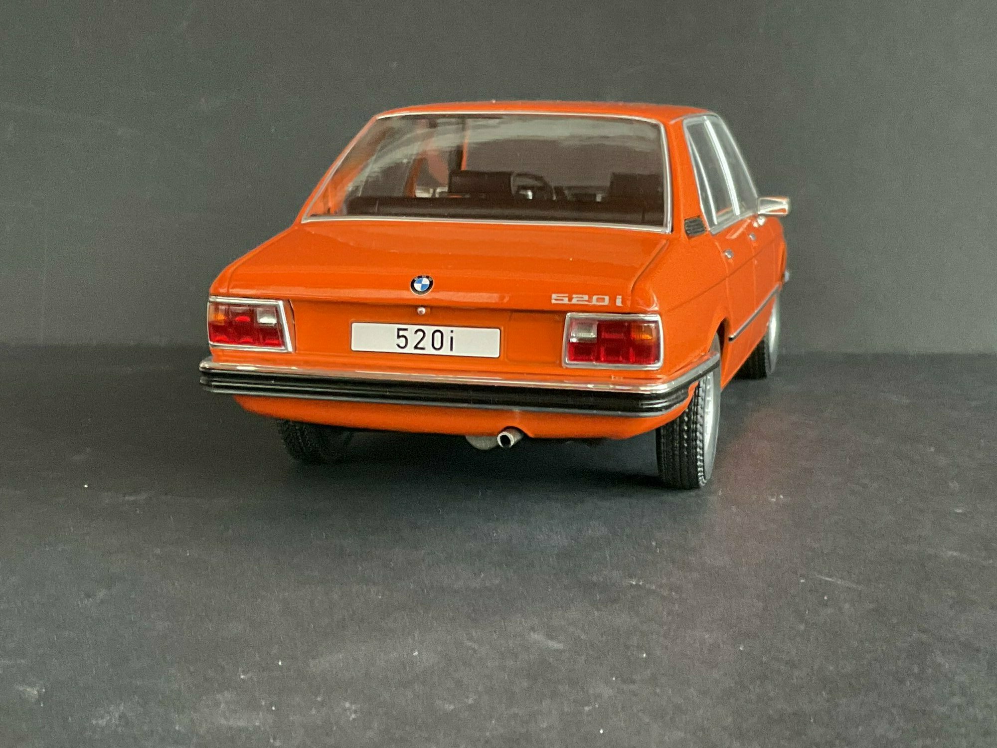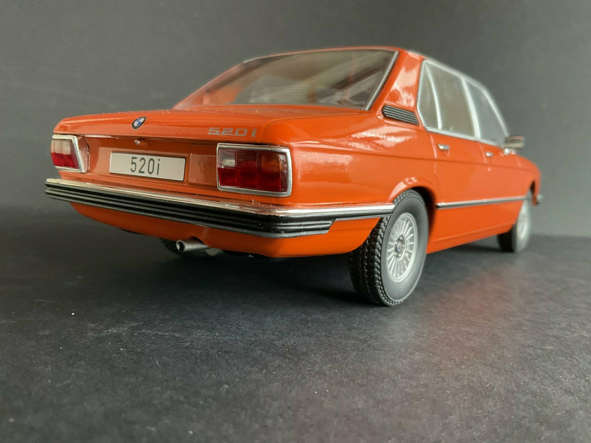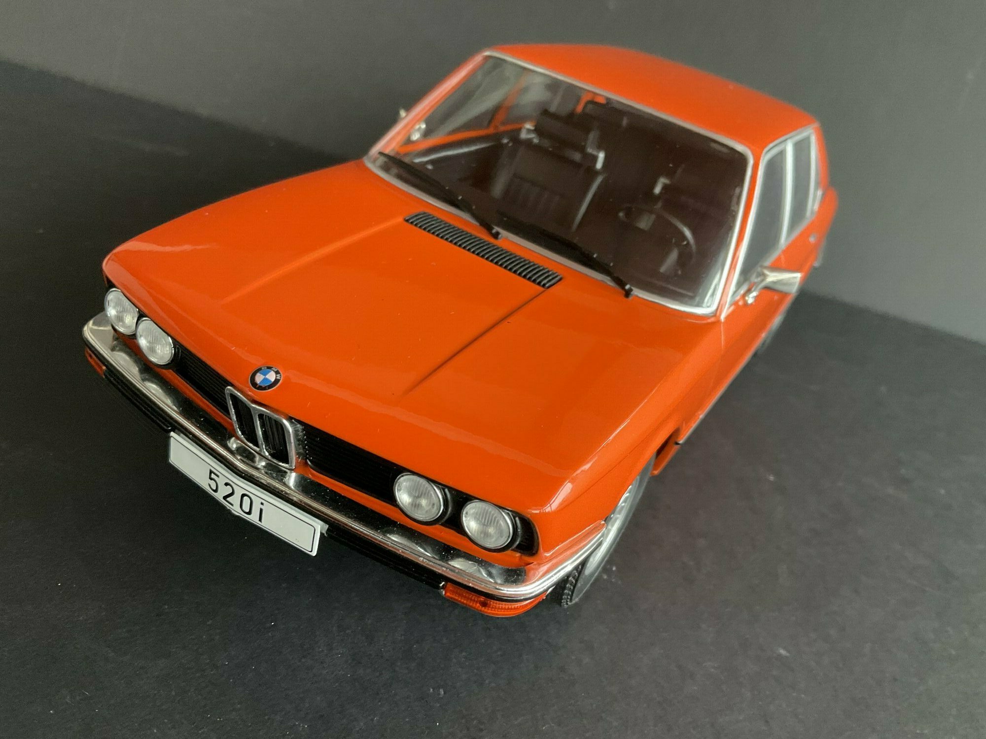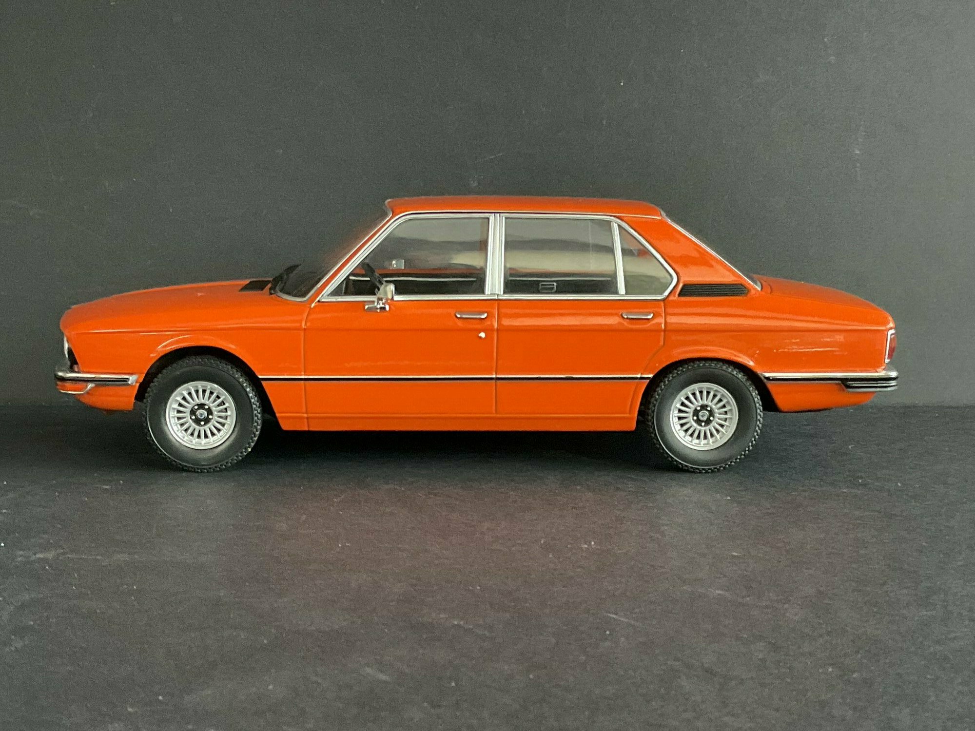 This model is made by MCG and is in 1/18 scale. It’s a die‑cast piece, so it’s sturdy and has a satisfying weight — and it captures the lines of the BMW 5er Limousine (E12) pretty well. The example belongs to the collector “TrolleyJack.” The paint is a strong orange that really fits the era — BMW offered a similar shade known as Inka‑Orange (color code 022). The photos show even gaps and correctly rendered trim along the flank and polished window surrounds. Up front you’ve got the twin round headlights with the black horizontal grille detail and the classic BMW kidney grille that defines the BMW 5er Limousine (E12). The bumpers are done as chrome strips with the hint of rubber inserts. At the rear you can spot the characteristic vent ahead of the C‑pillar, another E12 trait. The interior is in brown/earth tones, typical for the 1970s; the dash, three‑spoke wheel and center console are nicely represented. The multi‑spoke alloy wheels reference period‑correct BMW accessory rims; the front plate detail reading “520i” makes the intended derivative clear. Overall the die‑cast model gives the body’s proportions and edges a faithful feel, so the E12’s design language comes across well.