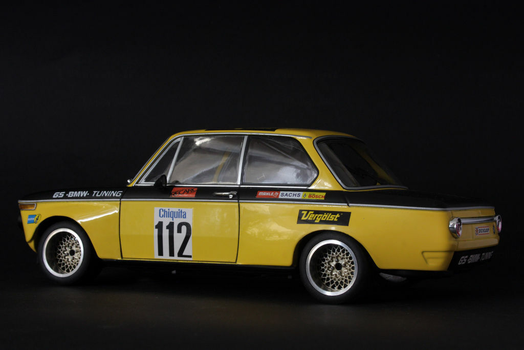 The paintwork of the BMW 2002 Gr.2 model by Minichamps is in a striking yellow and black scheme. The car bears the number 112 and various sponsor decals like Chiquita, Vergölst, and Dunlop. These details add historical authenticity and make the miniature look realistic and lifelike. The wheels have a intricate, fine design reminiscent of the original racing wheels, highlighting the sporty nature of the vehicle. All these features make the miniature a sought-after collector's item.