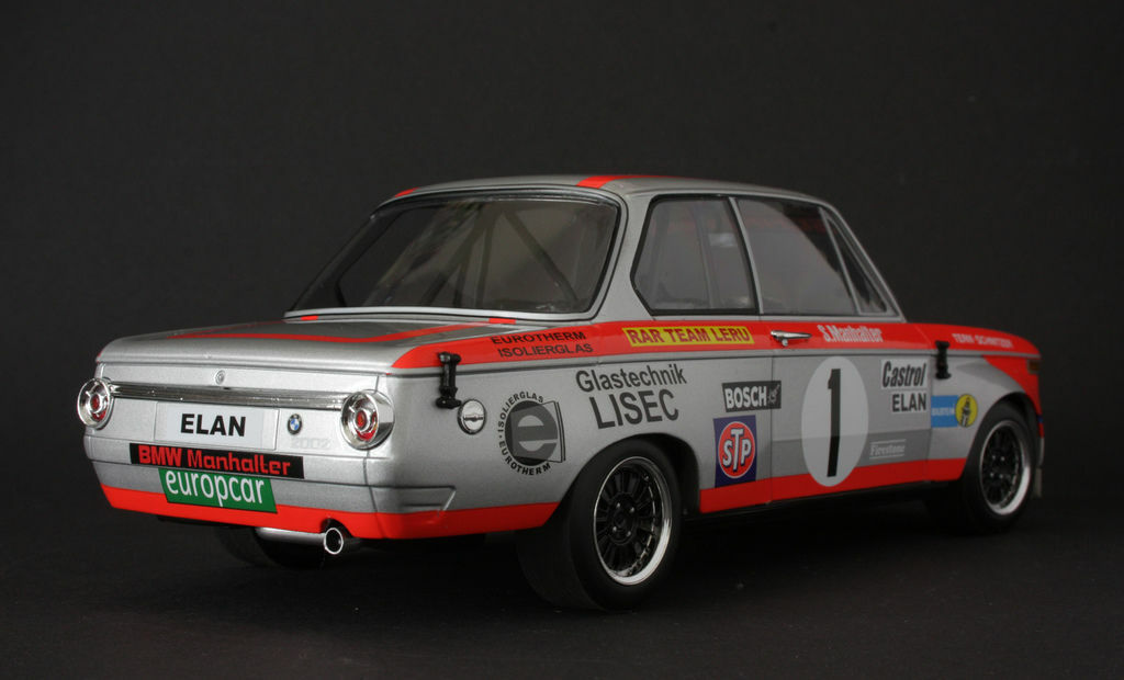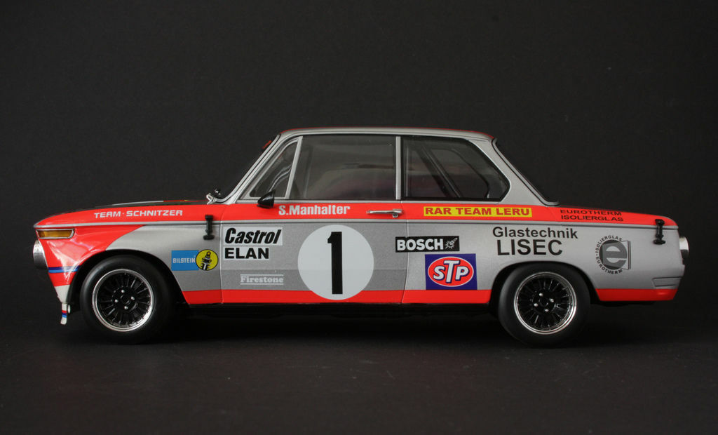 The miniature model of the BMW 2002 Schnitzer in 1/18 scale, manufactured by Minichamps, is an excellent example of detailed model craftsmanship. The diecast model is a precise reproduction of the original. The striking red and grey livery with sponsorship decals from Castrol, BOSCH, STP, Firestone, and Glastechnik Lisec gives the model an authentic racing look. Fine details like the accurate replication of headlights, the grille, and air intakes make this model a true collector's item. Notably, the original Team Schnitzer logos and driver inscription S. Manhalter add an extra touch of authenticity to the model. This model is a must-have for any serious model car enthusiast and collector.