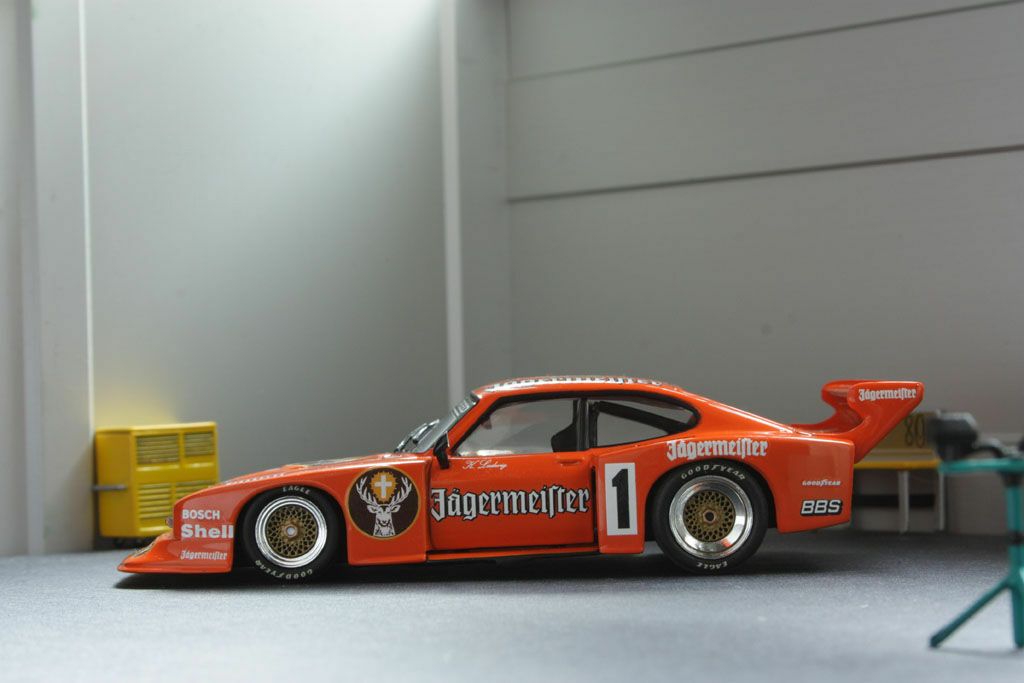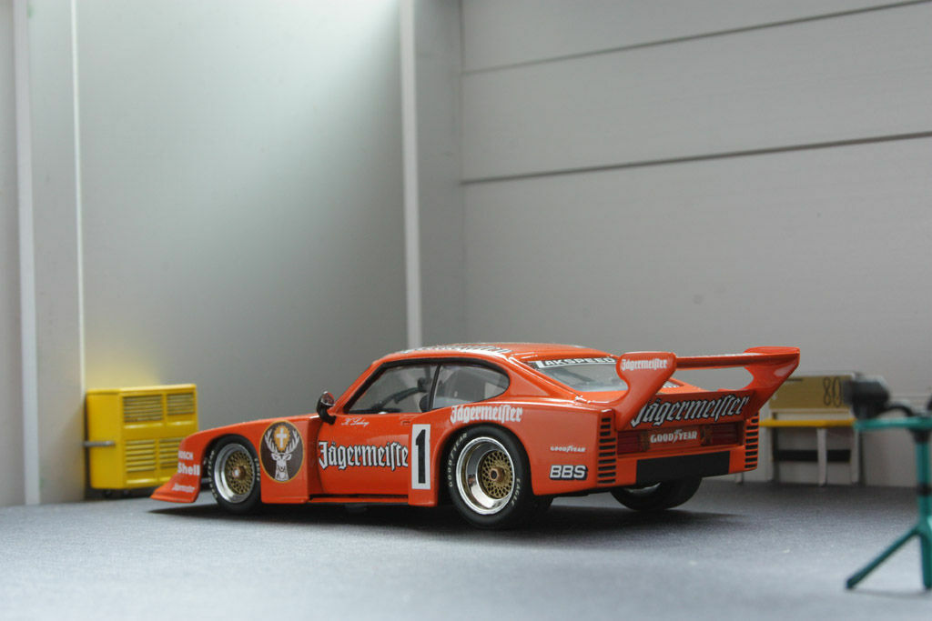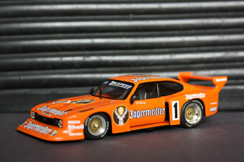 The model shown here in a scale of 1/43 was manufactured by Minichamps and is part of the collection of Modelly member "TrolleyJack." The model represents the Ford Capri III Gr.5 with a striking orange livery adorned with the sponsors' logos of Jägermeister, Shell, and Bosch. This livery is a faithful reproduction of one of the most famous designs of this car. The detailed reproduction of the model includes the exact proportions, precise replication of sponsor decals, and the aerodynamic features of the original. The realistic BBS wheels and the imposing rear spoiler showcase the care with which Minichamps constructed this model. Collectors worldwide appreciate this 1/43 scale model for its detail accuracy and historical significance.