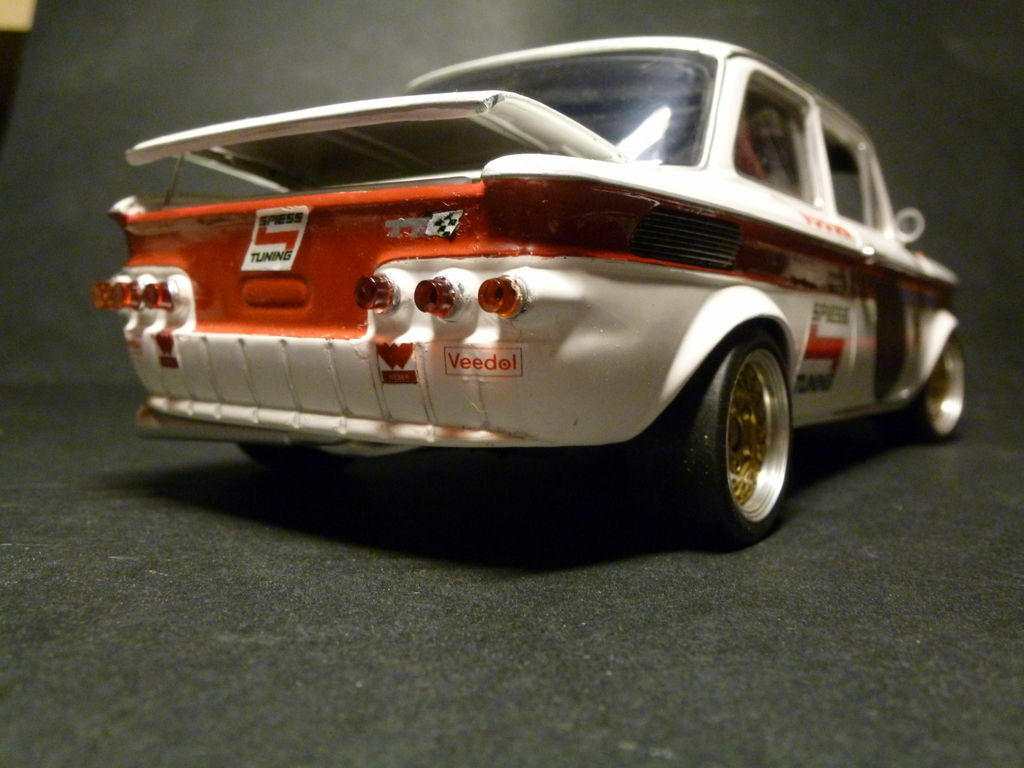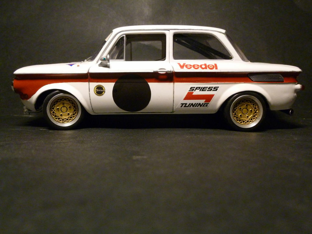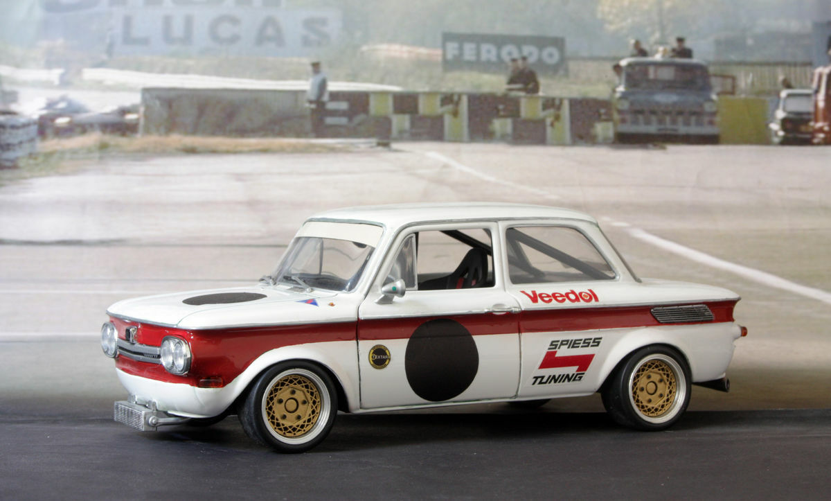 The model presented here is a 1/18 scale replica of the NSU 1000 TTS, manufactured by Revell. This collector's item is a detailed reproduction of the original and part of the collection of Modelly member "TrolleyJack." Please note that this model has been heavily modified and does not represent the original product produced by Revell. The modifications include special paint schemes and sponsor decals, such as the Veedol and Spiess Tuning logos. These details give the model a personalized touch and reflect the historical racing aesthetics.