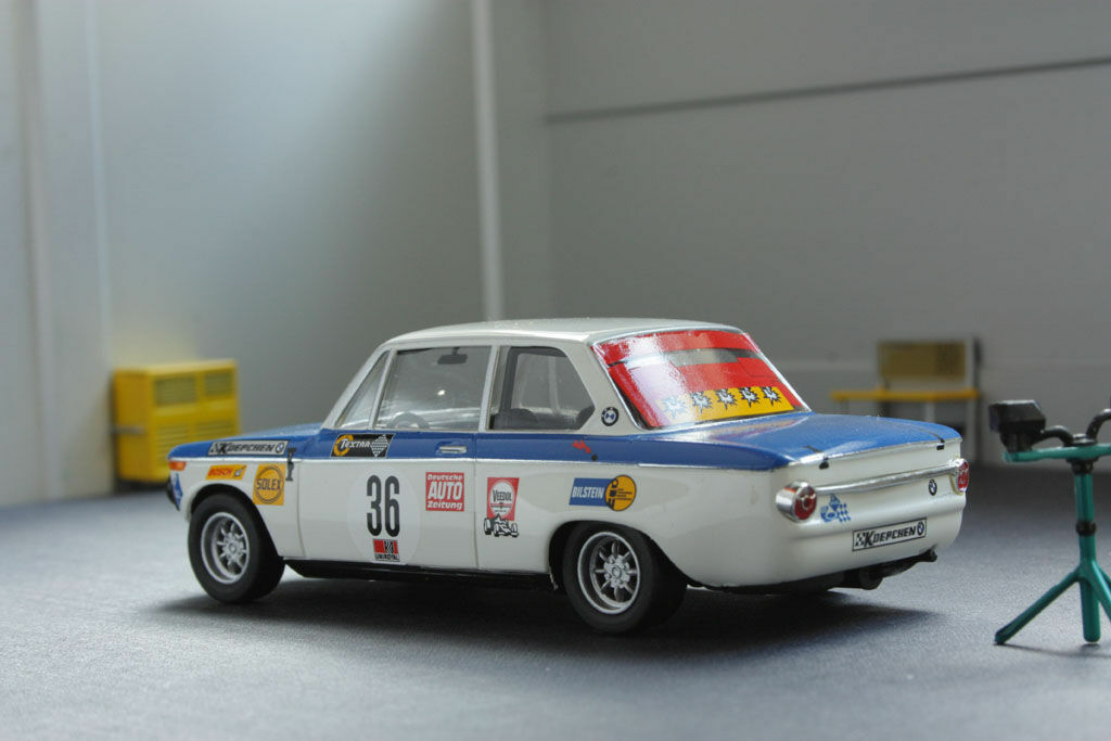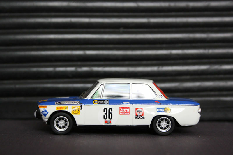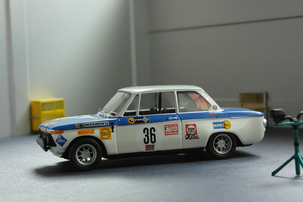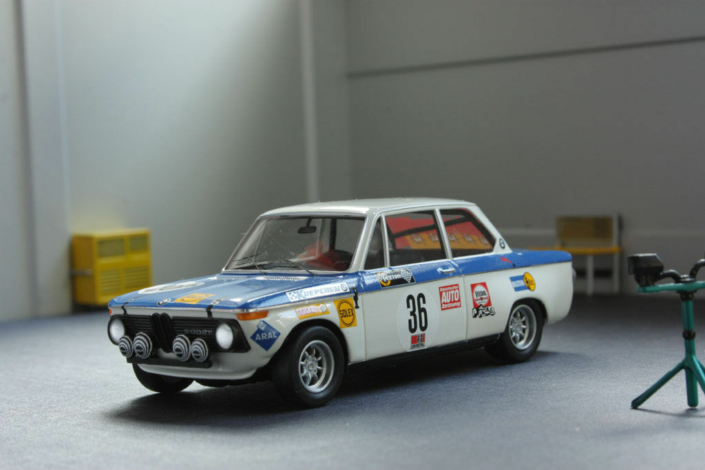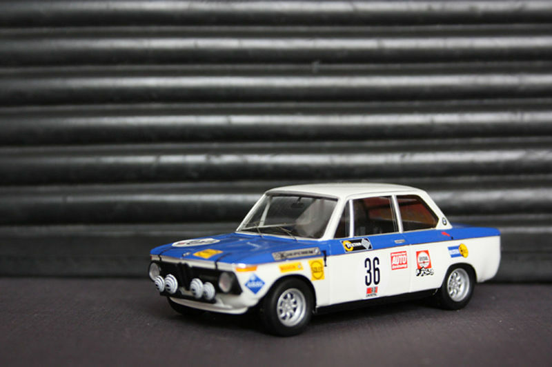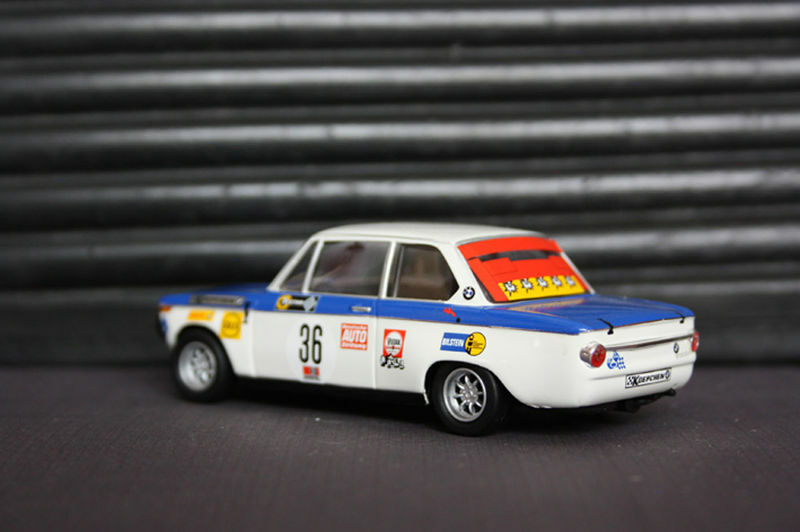 The model car from Trofeu in 1/43 scale, part of the collection from Modelly member "TrolleyJack," perfectly captures the BMW 2002 in racing trim. This model flaunts the race number 36 and features numerous sponsor logos, including ARAL, BOSCH, Texaco, and Veedol. One standout detail is the two-tone paint job in white and blue, giving the car a genuine racing vibe. The front is accentuated by four additional round headlights, while the back sports a red decal with a star pattern. Slim blue stripes run along the roof and sides, creating a dynamic yet cohesive appearance for the model.