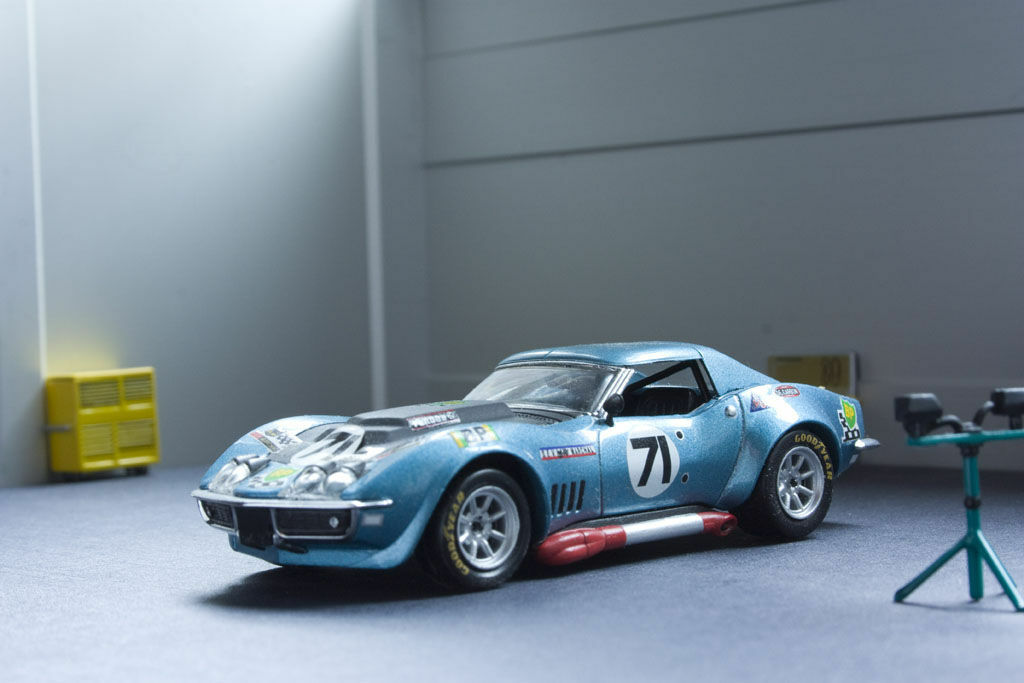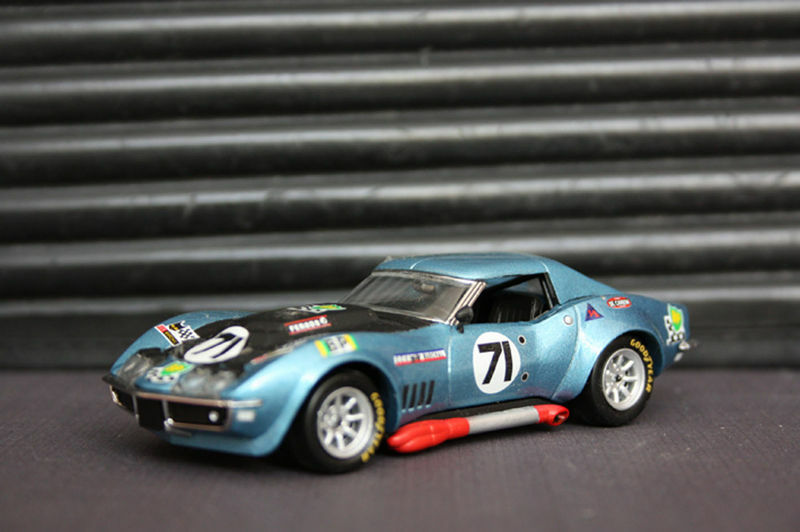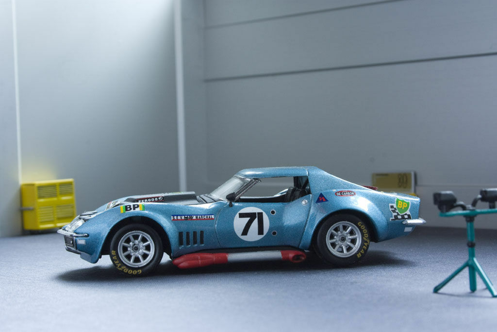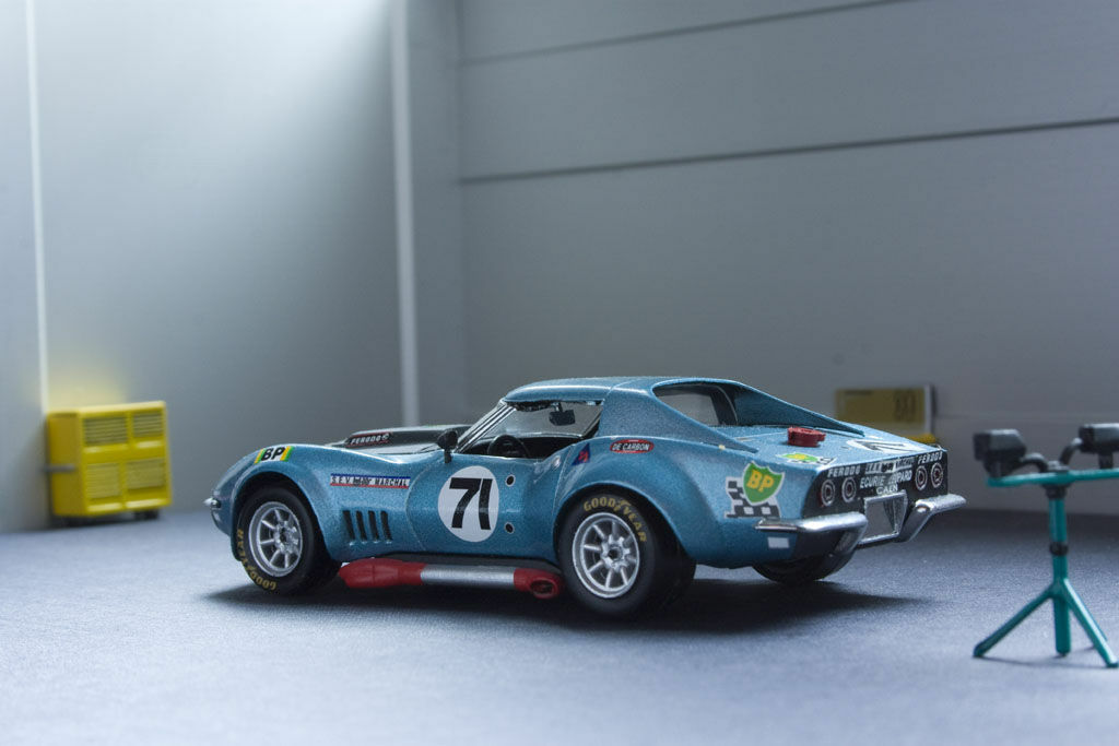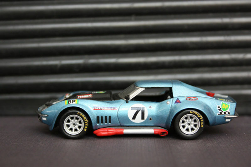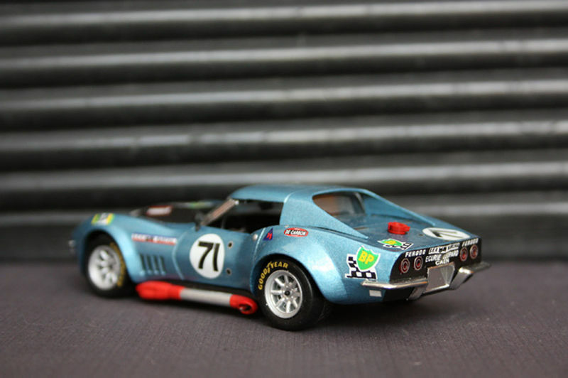 The model features a striking metallic blue finish that immediately catches the eye. The black racing stripes and the printed number "71" emphasize the racing heritage of the Chevrolet Corvette C3 L88. Additionally, various sponsor decals are visible on the car, including BP and Ferodo. These sponsor logos are strategically placed on the body, adding an authentic racing aesthetic to the model. The combination of paint scheme and attention to detail makes this model a standout piece in any collection.