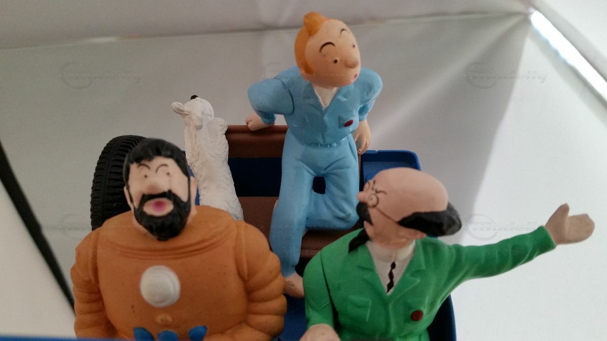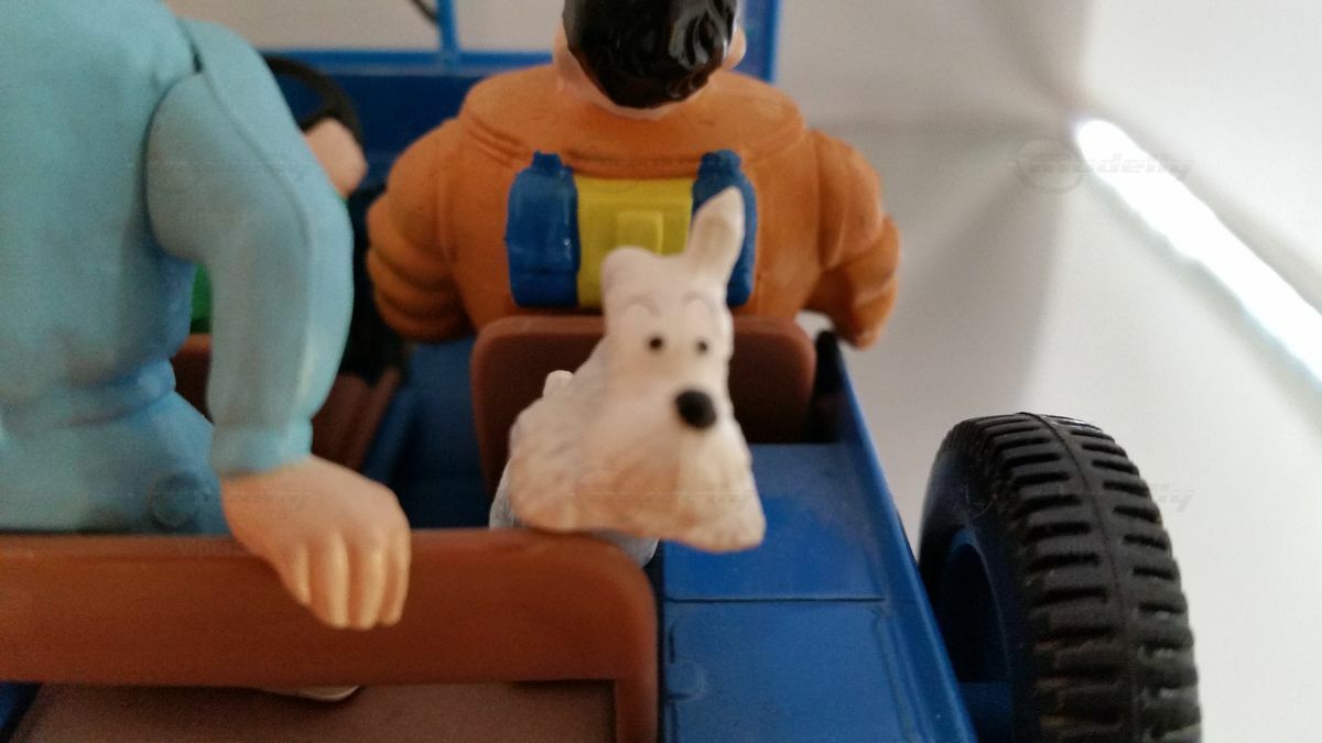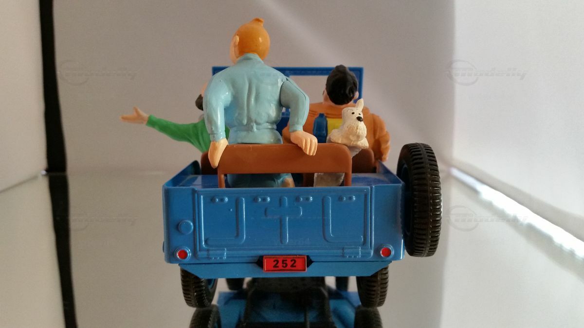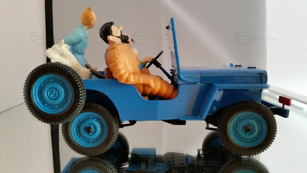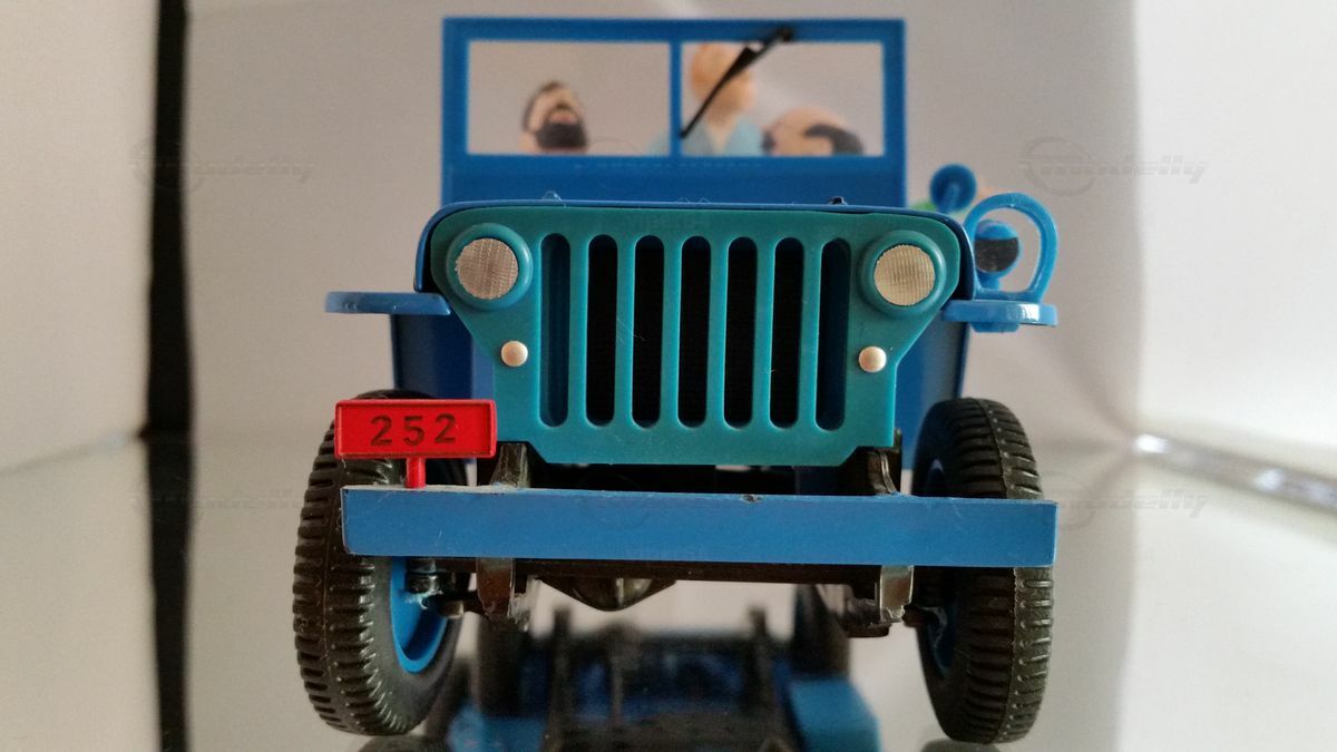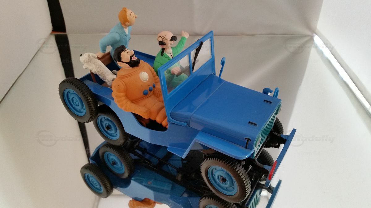 The 1/18 scale diecast model car made by Gate offers a detailed replica of the original Willys CJ-3A. Displayed as part of Modelly member "viper64's" collection, the model showcases realistic tires and an accurate depiction of the chassis. The vehicle is painted in a striking blue color that is well highlighted in the photos. The colors and shapes of the minifigures sitting on the model, including Humphrey Tintin, Professor Calculus, and Captain Haddock from the famous "Tintin" comics, are accurately portrayed, adding to the authentic overall effect. This model, based on the original, features authentic details such as the steering wheel, front grille, and hood, all reproduced to scale.