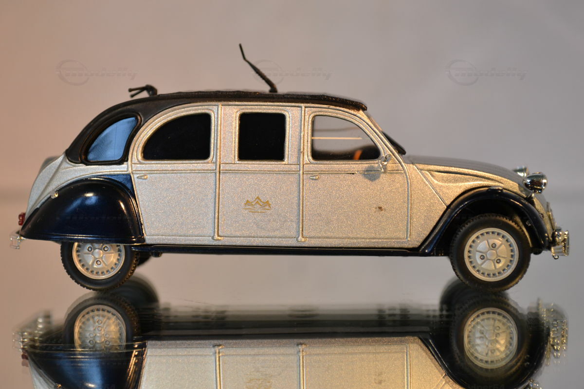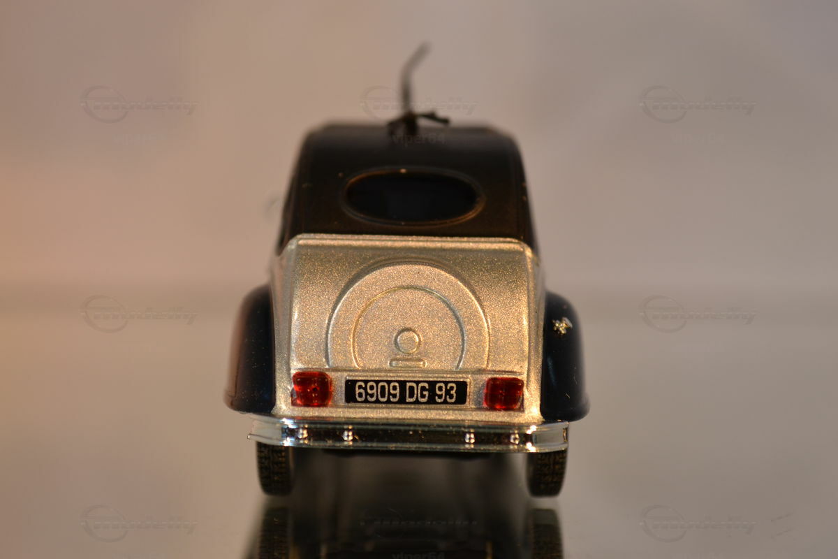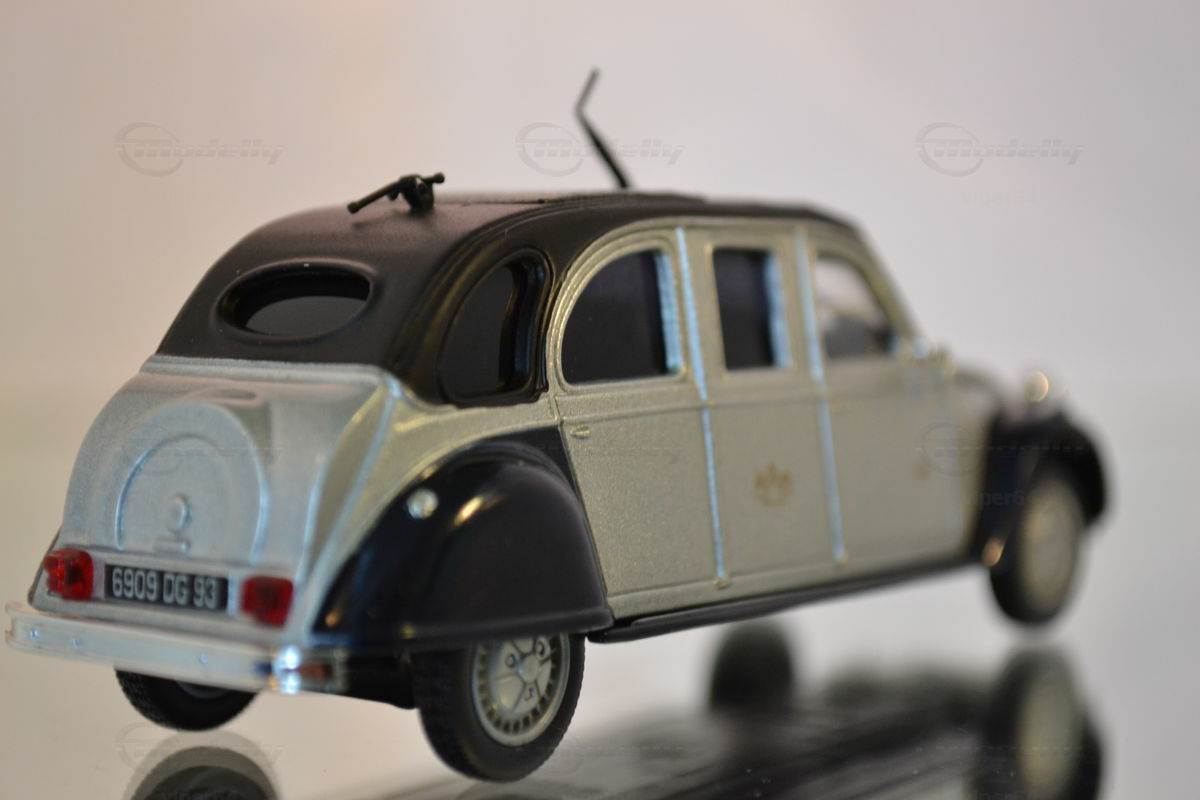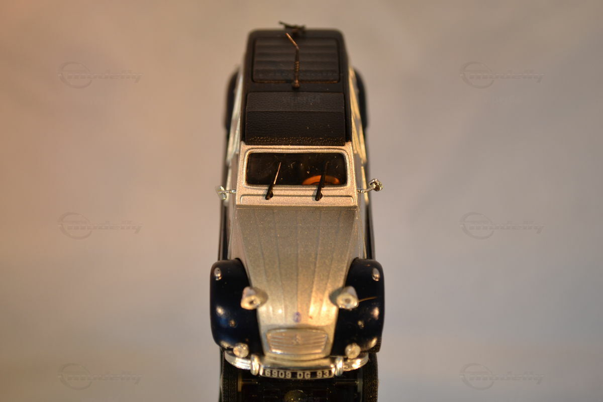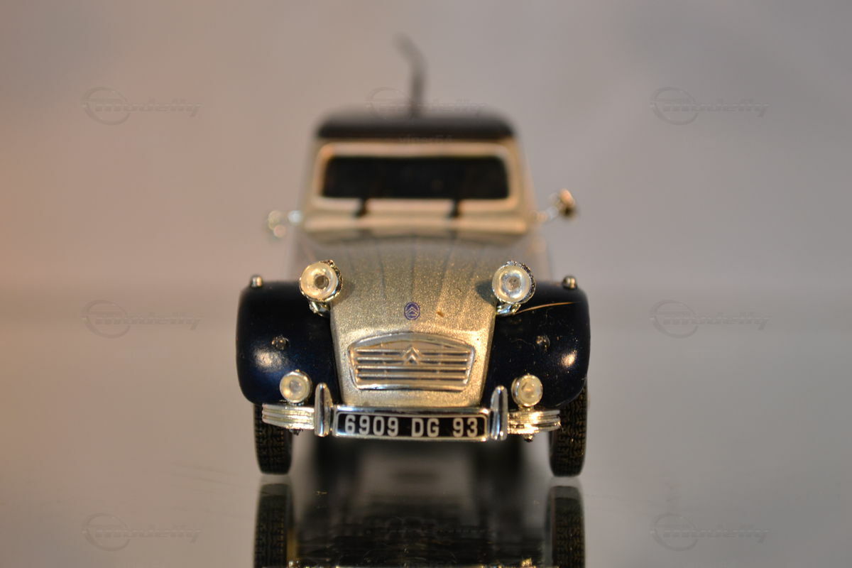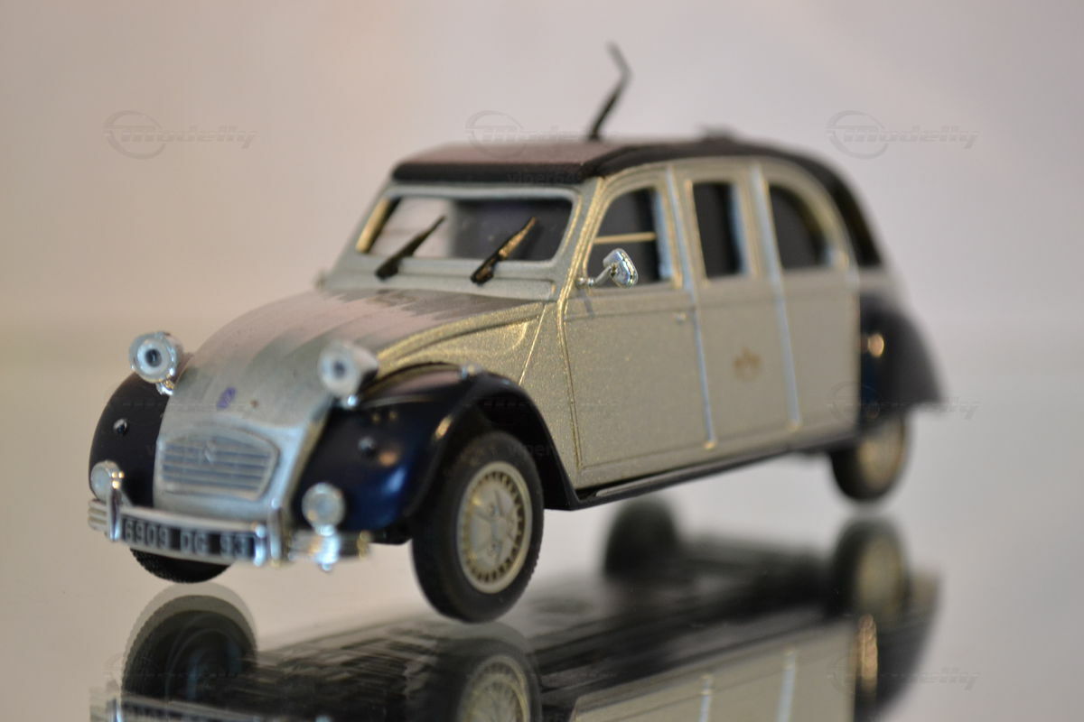 The collector's model of the Citroën 2 CV Sedan in a 1/43 scale by Norev boasts special and accurately replicated details. Made from die-cast material, the model showcases a precise reproduction of the proportions and lines of the original car. Notable are the silver paintwork of the model and the black and dark blue accents on the fenders and roof, giving it an authentic appearance. The specially reproduced wheels highlight the attention to detail. Model car collectors worldwide appreciate such precise replicas that honor the historical significance of the original.