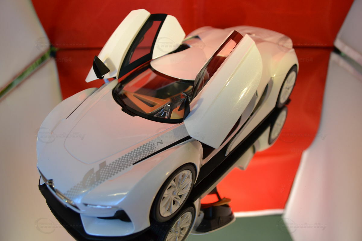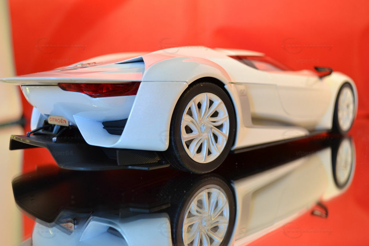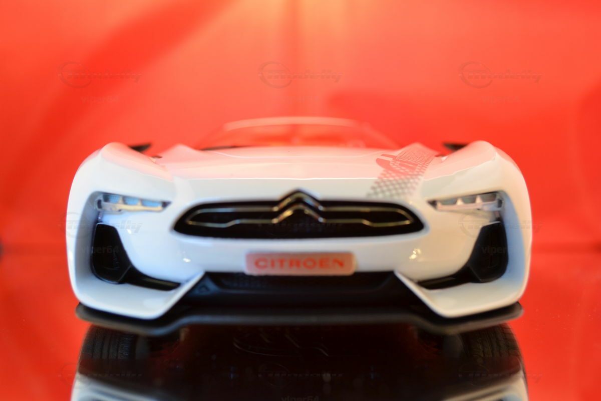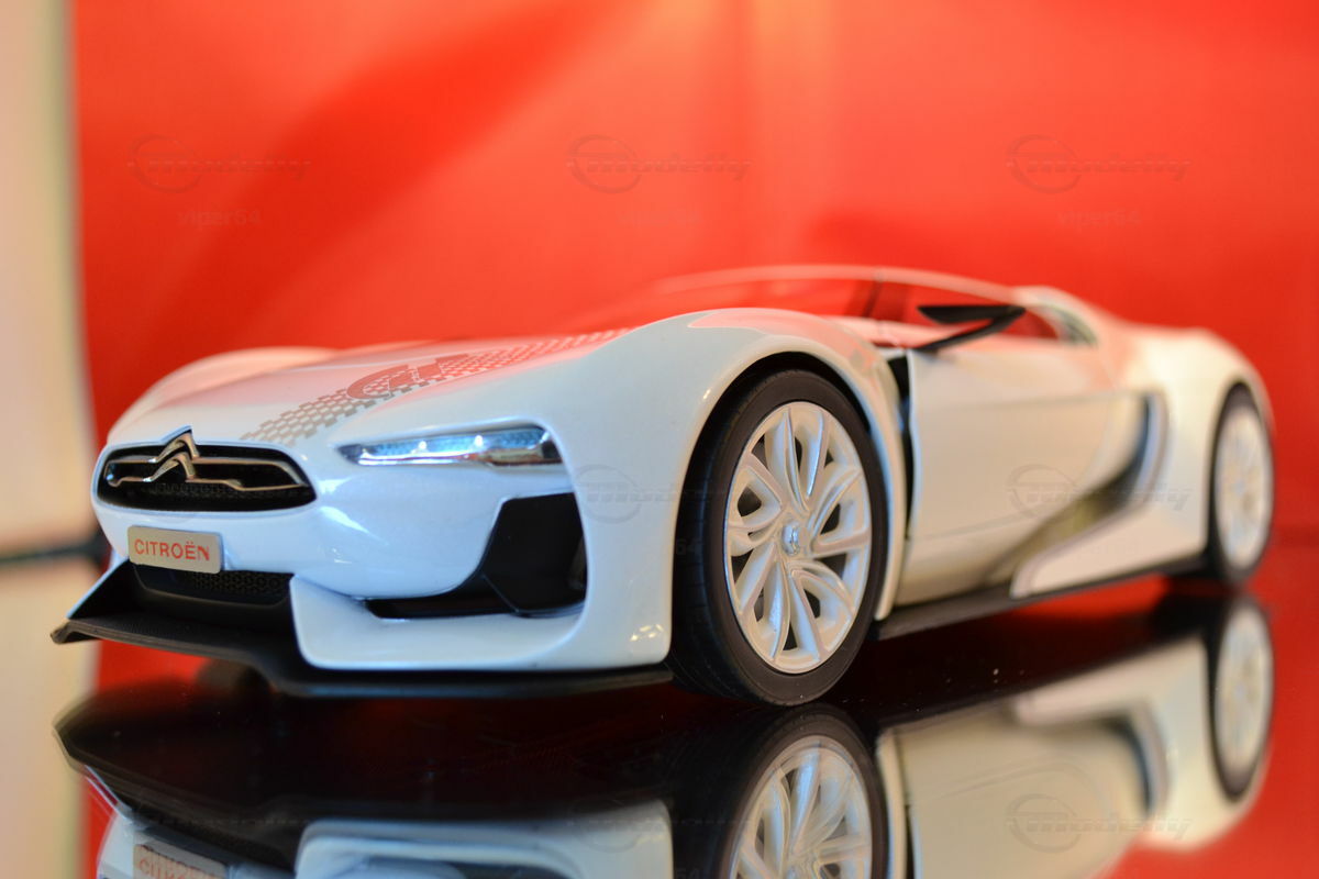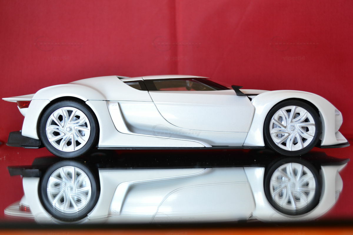 The scale model car shown here in 1/18 scale by manufacturer Norev skillfully captures the captivating aesthetics of the Citroën GT for display on a collector's shelf. These models are made of high-quality diecast material and are renowned for their attention to detail and sturdy construction. What stands out about this model is the precise replication of the curved lines and distinctive shapes of the original. The everyday usability of Norev models and their attention to detail make them popular collector's items worldwide. The model's paint is a glossy white that perfectly showcases the futuristic contours of the vehicle. Upon closer inspection, one can appreciate the intricate details of the air intakes and rear end.