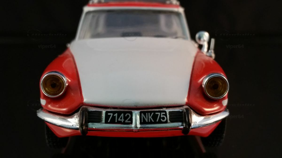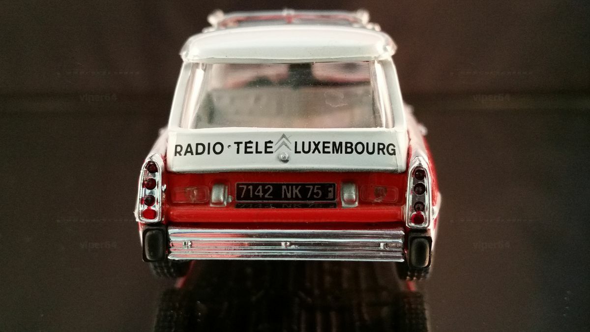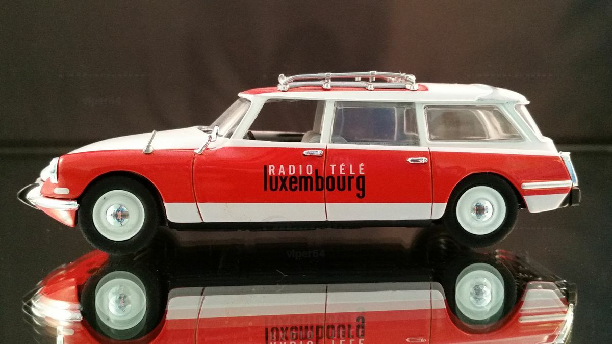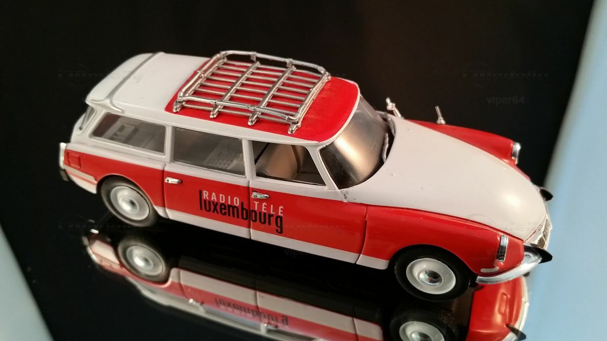 The model shown here is a 1/43 scale model car manufactured by Norev. The model represents the Citroen ID 19 Break and is styled in a Red-White color combination. It is a 1/43 die-cast model and, thanks to its detailed replica, is highly sought after by collectors. The vehicle sports the "Radio Télé Luxembourg" emblem and features a roof-mounted luggage rack, clearly visible in the photos. This miniature is part of the collection of Modelly member "viper64". The attention to detail makes this model a standout in any collection.