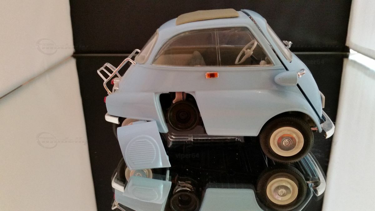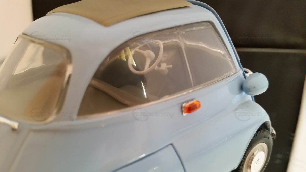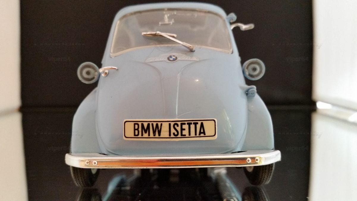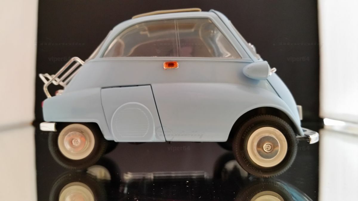 The model car presented here is a 1/18 replica of the BMW Isetta 250, manufactured by Revell. This model is made of diecast, ensuring high detail accuracy and durability. This Isetta replica is part of the collection of Modelly member "viper64". In the photos, it is clear to see how meticulously Revell captured the original design: the blue tone of the bodywork is perfectly rendered, and the model features realistic details like the individually applied windshield wiper blade and small side mirrors. The model also has a well-replicated luggage carrier at the rear, further emphasizing the classic design of the Isetta era.
