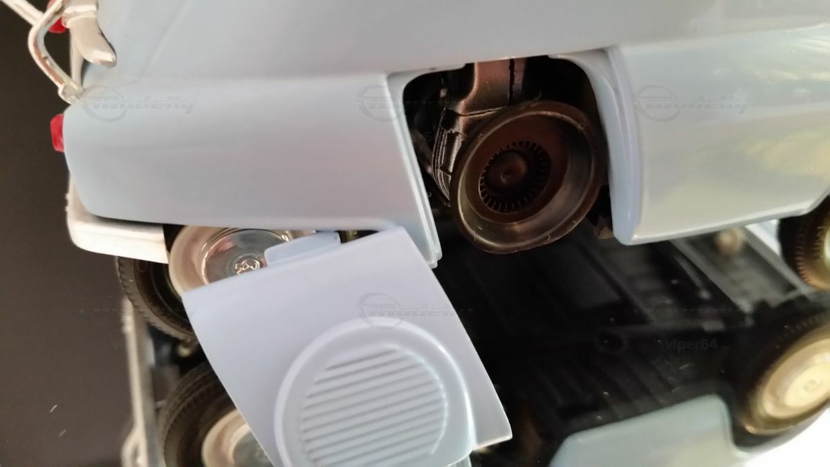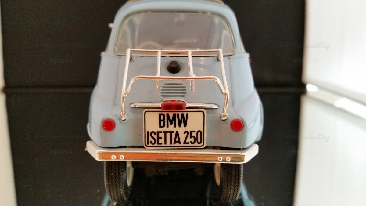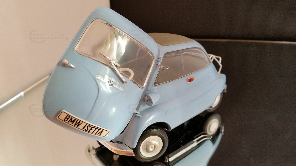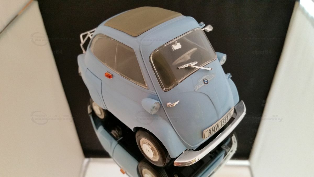 The model car presented here is a 1/18 replica of the BMW Isetta 250, manufactured by Revell. This model is made of diecast, ensuring high detail accuracy and durability. This Isetta replica is part of the collection of Modelly member "viper64". In the photos, it is clear to see how meticulously Revell captured the original design: the blue tone of the bodywork is perfectly rendered, and the model features realistic details like the individually applied windshield wiper blade and small side mirrors. The model also has a well-replicated luggage carrier at the rear, further emphasizing the classic design of the Isetta era.