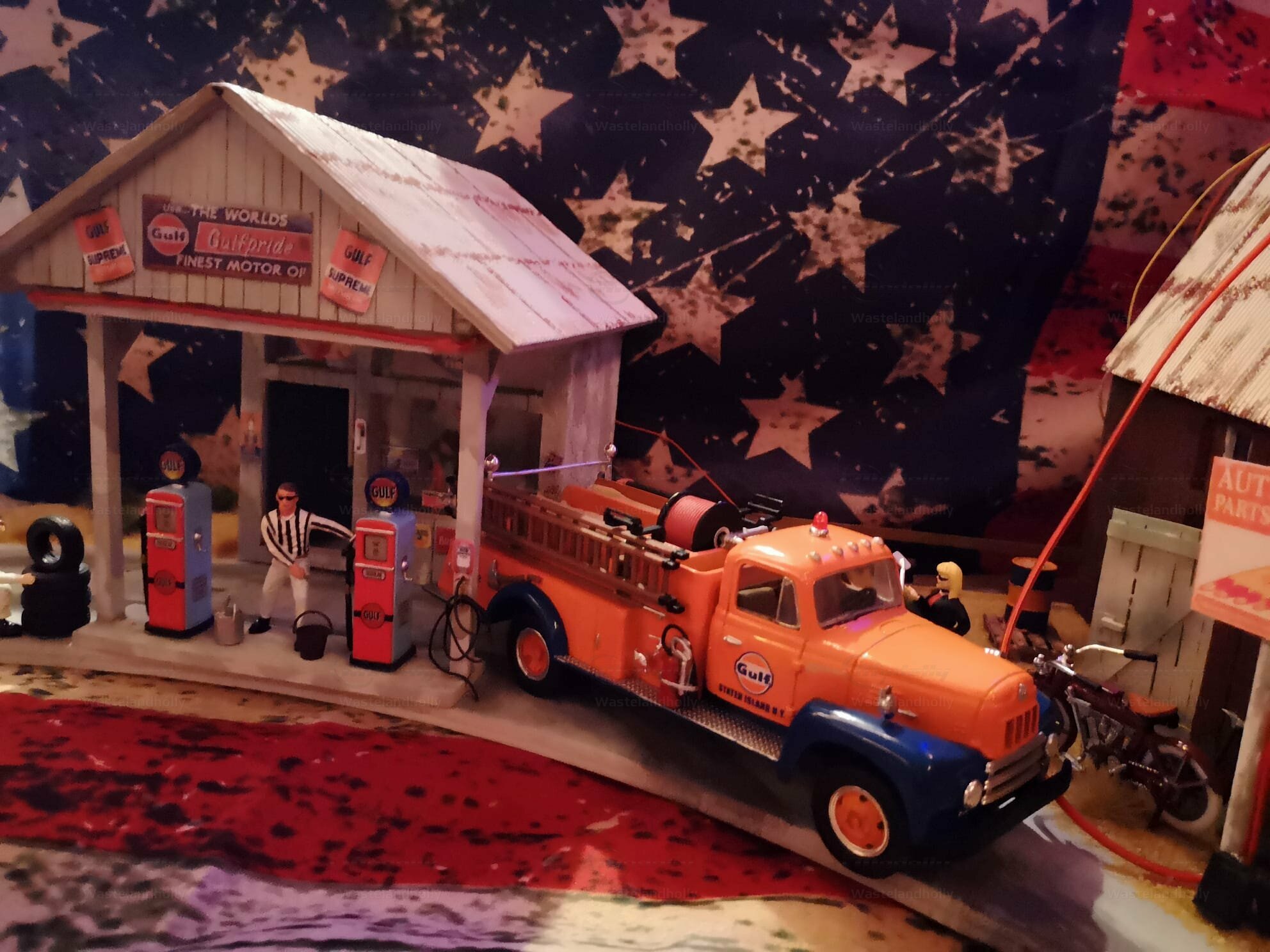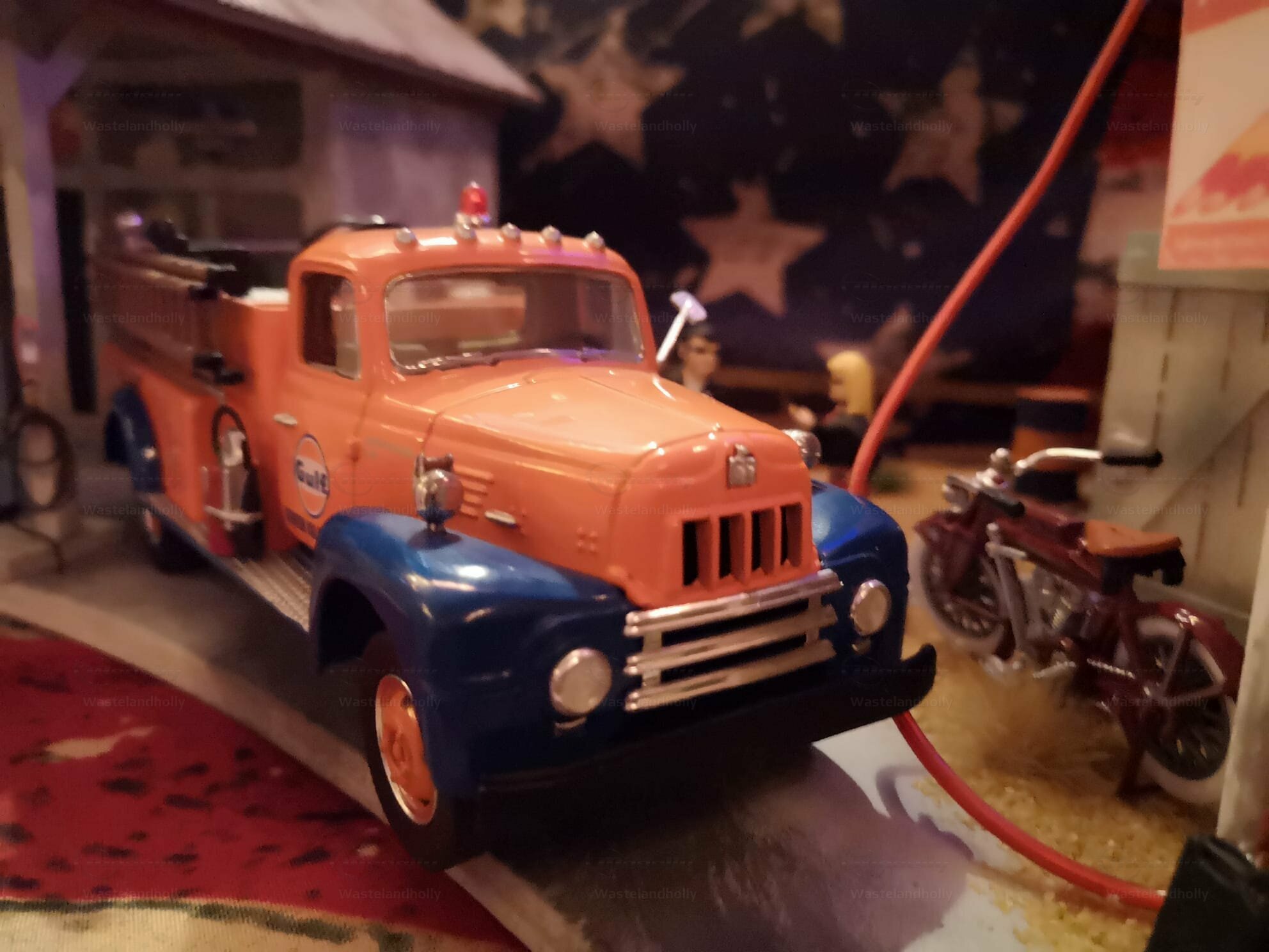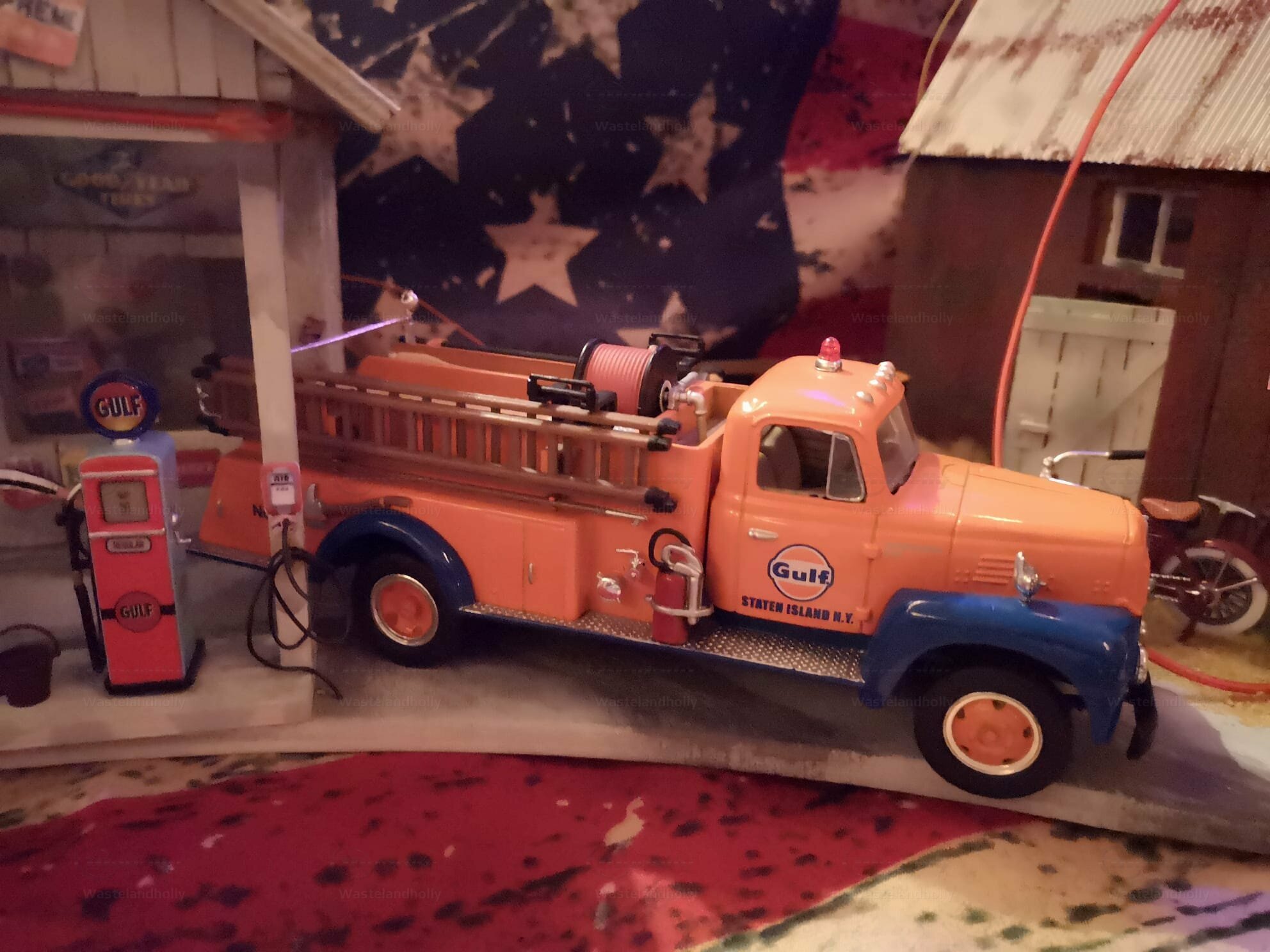 This 1/34 scale miniature by First Gear is a detailed and accurately reproduced version of the classic International R-190 that would delight collectors. The miniature by Modelly member "Wastelandholly" showcases a fire department variant in bright orange and blue, adorned with the "Gulf" gas station logo. Made from diecast material, it offers high durability and authenticity. It is evident that every detail has been carefully and faithfully reproduced, from the tiny hoses and ladders to the small buttons and firefighting equipment on the vehicle.