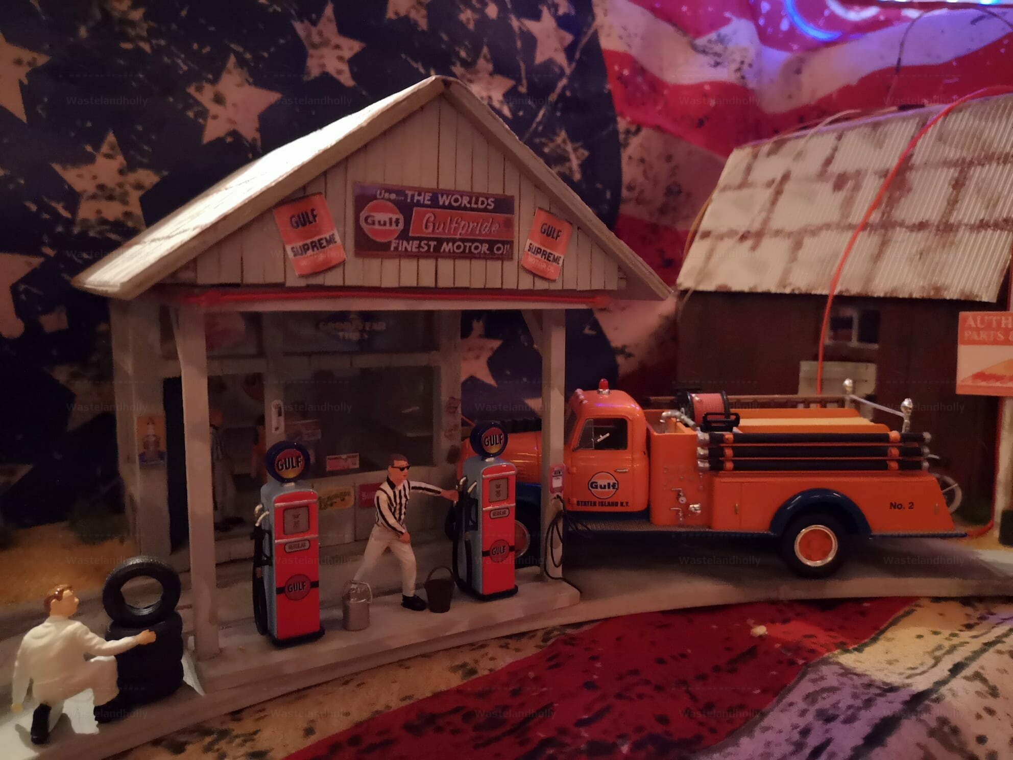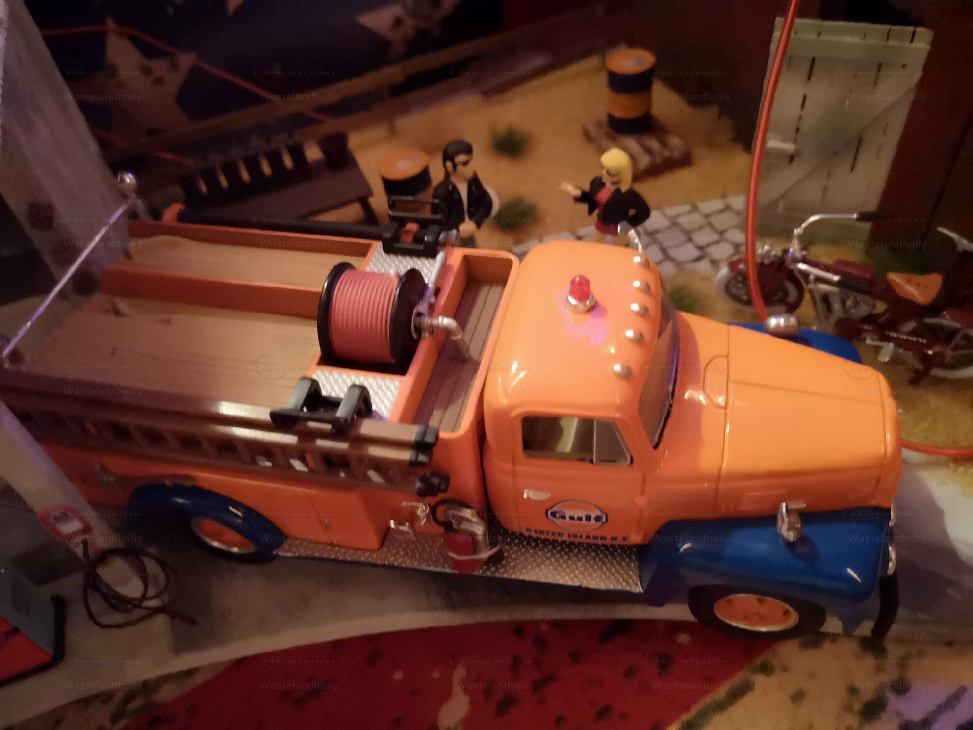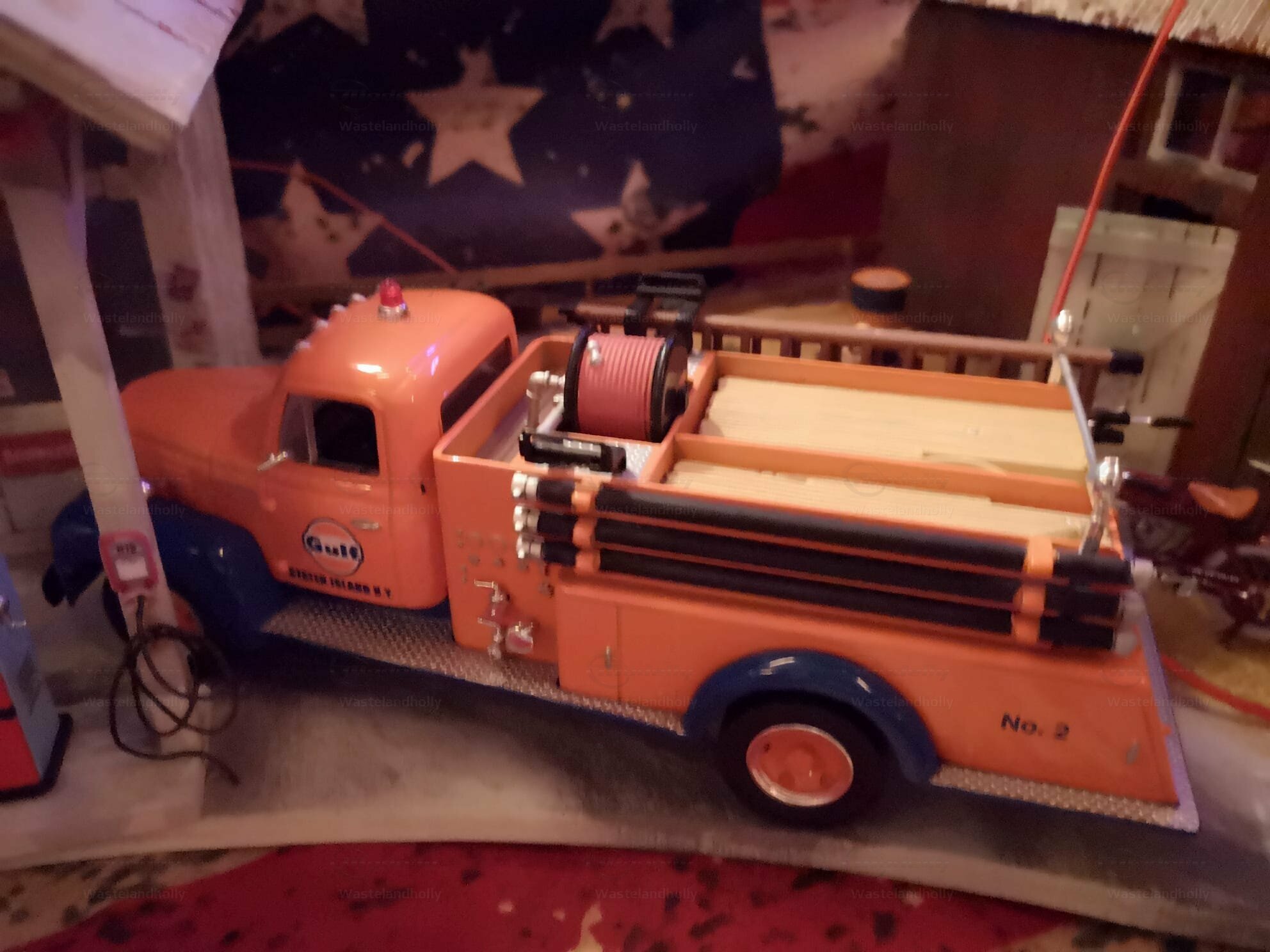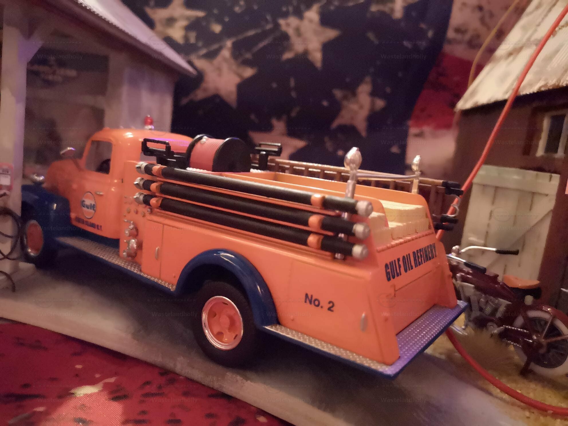 A closer look at the miniature reveals how detailed and specific it is designed. The "No. 2" inscription on the side of the vehicle suggests a fire department unit, and the color-matched paintings and logos make it eye-catching. The orange and blue color tones represent the branding of the "Gulf" gas station, adding a historical context. The interior and equipment also reflect the functionality of the original. The fire hoses, ladder mounts, and small hand tools have been meticulously replicated and placed.
