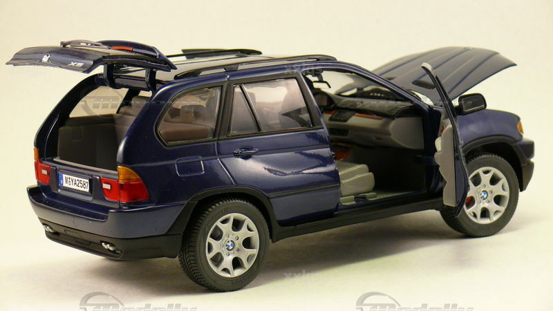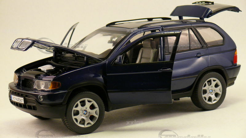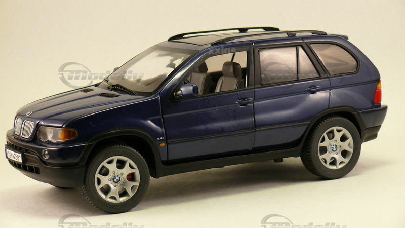 The miniature model of the BMW X5 (E53) presented here, manufactured by Anson in a 1/18 scale, is a perfect collectible for model car enthusiasts. The model is a faithful recreation of the actual vehicle, featuring signature elements like the distinctive kidney grilles, stylish headlights, and the characteristic rear design. The model's paintwork seemingly portrays a deep blue hue that accentuates the vehicle's elegant design. Noteworthy are the intricate details such as the realistically replicated wheels, the small BMW logos on the wheel caps, and the precisely crafted interior.