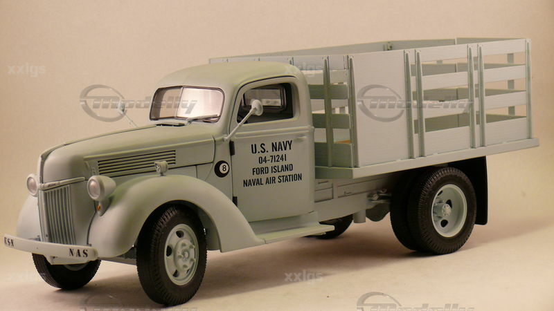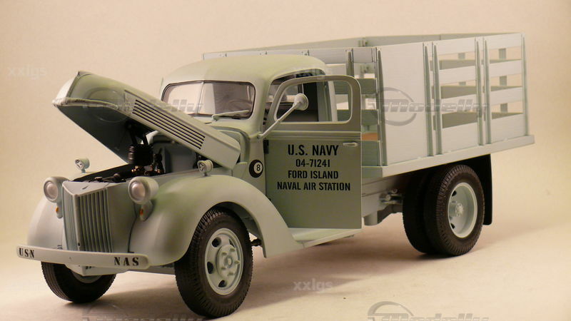 This 1/16 scale model car by Highway 61 is part of the collection of Modelly member "xxlgs". It stands out for its precise reproduction of the Ford Stake Truck from the 1938-1941 generation. The inscription "U.S. Navy, Ford Island Naval Air Station" on the side and license plate gives the model a special historical context, making it particularly appealing to military vehicle collectors. The precise replication of the body shapes and paintwork underscores the high-quality manufacturing process. This model replica not only represents technical perfection but also exudes a stylish aesthetic that captures the charm and functionality of the historical prototype, making it prominently visible.