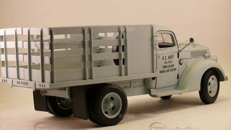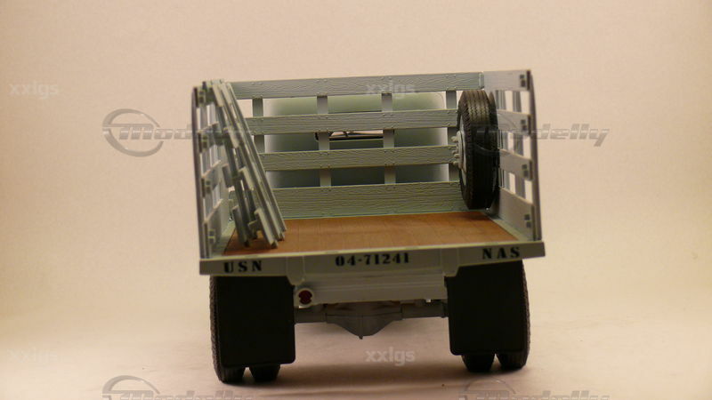 The miniature presented here is a model car in 1/16 scale, manufactured by Highway 61. This model reflects the detailed and precise craftsmanship of the original. Notable details include the authentic military grey paint with U.S. Navy insignia and the realistic design of the wooden elements on the cargo bed. Additionally, small details such as the silver chrome side mirrors and the accurately replicated tires with specific tread patterns stand out. The grille and headlights are also realistically depicted, capturing the historical charm of the vehicle.