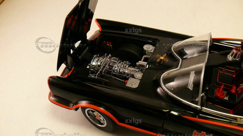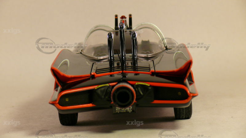 The model shown here is a 1/18 scale replica of one of the most famous cars in television history, the Batmobile. The miniature model is a collector's item produced by Hot Wheels Elite. The model is made of diecast, giving it a very robust and authentic look. The details of the vehicle are meticulously reproduced, including the distinctive red accent lines along the body and the Bat logo on the doors and hood. The iconic double-dome windshields and antennas on the rear of the vehicle are excellently replicated from the original. The miniature collector "xxlgs" has added this model to their collection, highlighting its significance.