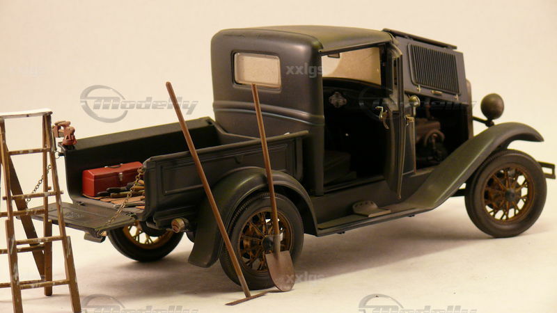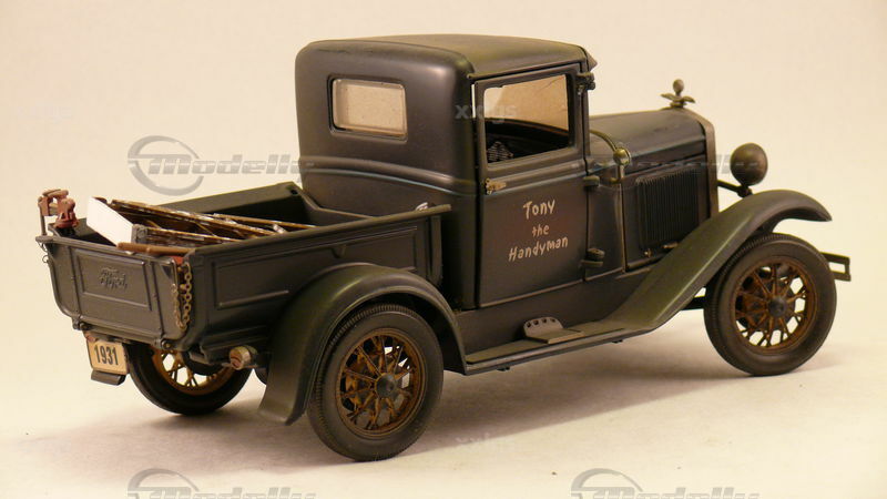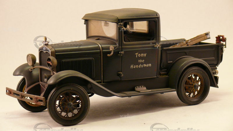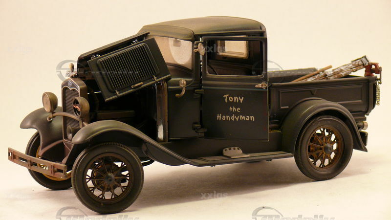 The model car is in a 1/18 scale and exhibits a meticulously crafted reproduction of the Ford Model AA. The model's paintwork is matte black, providing the vehicle with a rustic and authentic appearance. The "Tony the Handyman" signage on the doors adds a personal touch to the model. Also noteworthy are the replicated wooden slats on the cargo bed and the realistic spare tires on the rear of the vehicle. The prominent fenders and clearly defined metal wheel covers give the model a special precision and attention to detail. The Motor City Classics model in 1/18 scale is a remarkable collector's item that impresses with its fine craftsmanship and accuracy.