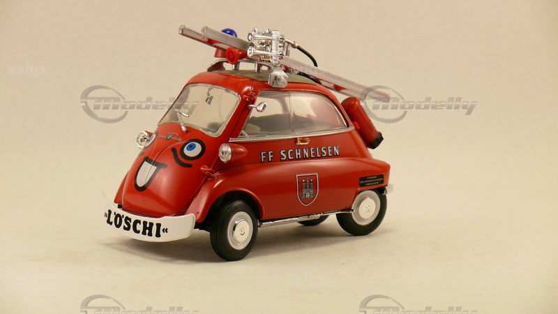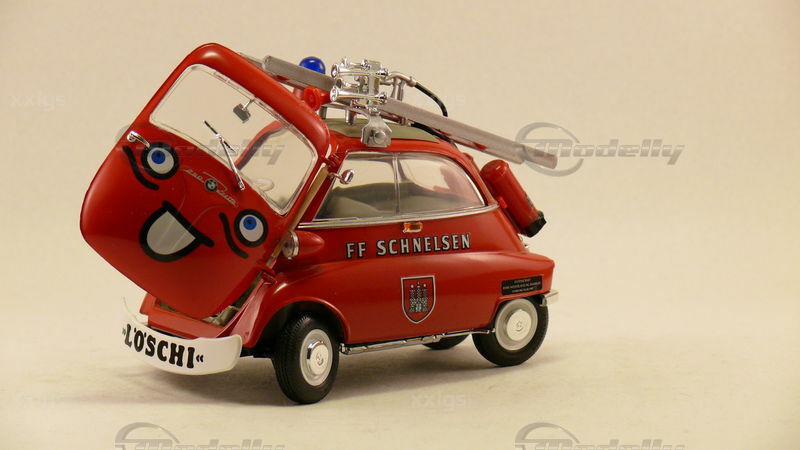The model represents a true-to-scale replica of the original BMW Isetta, perfectly executed by Revell. Visible technical details include the chrome headlight rings and bumpers, giving the vehicle a classic look. Additionally, the small wheels are mounted in a scale-accurate design, with the rims and tires faithfully replicated. The miniature model in 1/18 also displays the characteristic front door, a distinctive feature of the real Isetta.The painting of the model deserves special attention. The fire department livery in bright red, combined with the blue-white details and markings, catches all eyes. The "LÖSCHI" print on the front of the vehicle adds a charming and functional touch to the model. The silver accents of the ladder and the authentic fire extinguishers are also meticulously designed, showcasing the attention to detail that plays a significant role in this model.