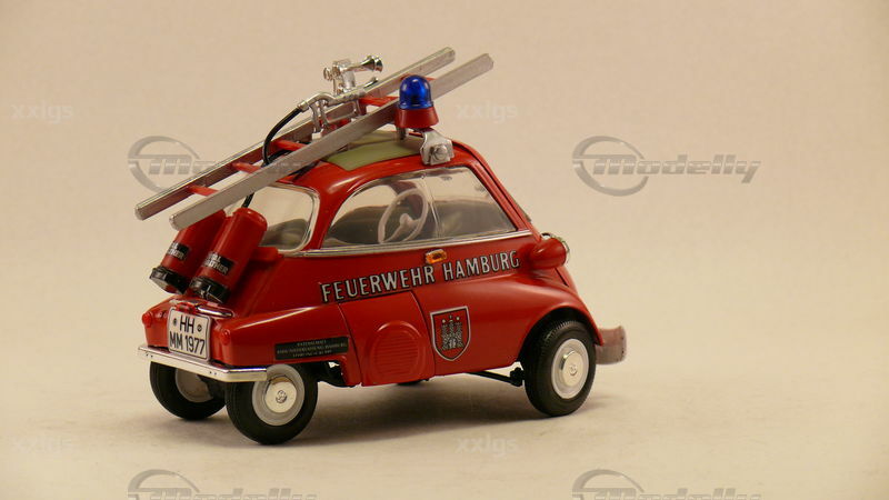 For collectors and miniature enthusiasts, Revell presents this model of the BMW Isetta in a 1/18 scale, offering precise details and high-quality craftsmanship. Members of the model community, like "xxlgs" on Modelly, appreciate the superior execution. This model car showcases the Isetta in a special edition as a fire department vehicle, identifiable by the red paintwork and corresponding markings such as "FEUERWEHR HAMBURG."In the photos uploaded by "xxlgs", it is evident that the model is meticulously detailed with a ladder and fire extinguishers on the roof. The side features the letters "FF SCHNELSEN" printed, hinting at a fictional or historical fire department badge. The "FEUERWEHR HAMBURG" inscription on the back and the special fire department symbols give the model an authentic appearance.