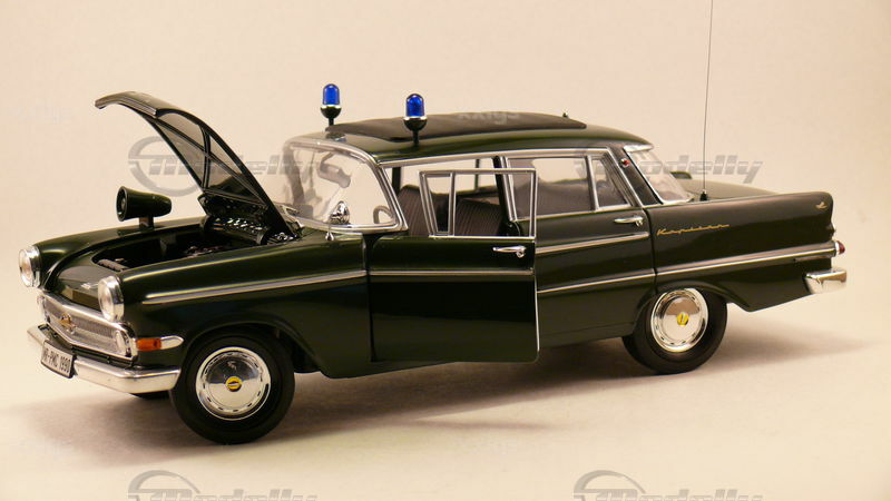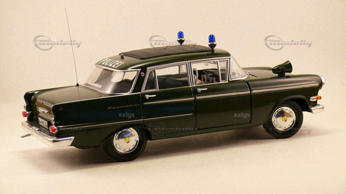 The faithful reproduction by Revell in a scale of 1/18 exhibits exceptional detail accuracy. The photos convincingly display the meticulously replicated headlights, taillights, and the extensive chrome applications typical of the Opel Kapitän P2.6. Particularly noteworthy are the two blue police lights on the roof, the "Polizei" lettering on the windshield, and the antenna at the rear. The interior of the model showcases realistic seats, dashboard, and even small details like the rearview mirror and door panels. This meticulous attention to detail makes the model car a coveted collector's item for model car enthusiasts and lovers of historical vehicles.