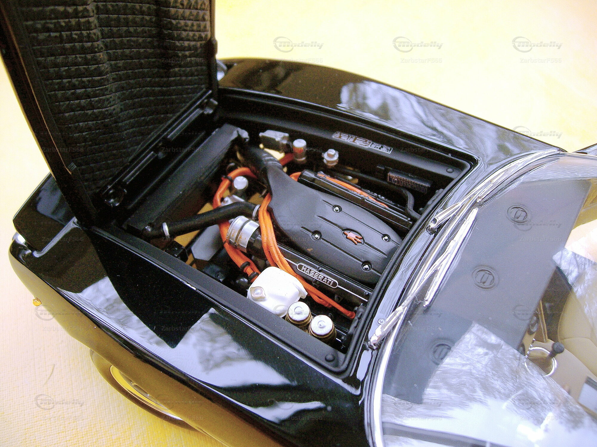 The 1/18 scale miniature model by AUTOart showcases these details excellently. The carefully crafted engine bay details are striking, realistically replicating cooling hoses and closure elements. The doors, hood, and trunk can be opened, with the interior detailing done with great precision. The seats, dashboard, and all control elements are accurately modeled and reflect the original design elements of the Maserati Ghibli. The model's paintwork is glossy black, a classic finish that accentuates the luxurious appearance of the original vehicle.