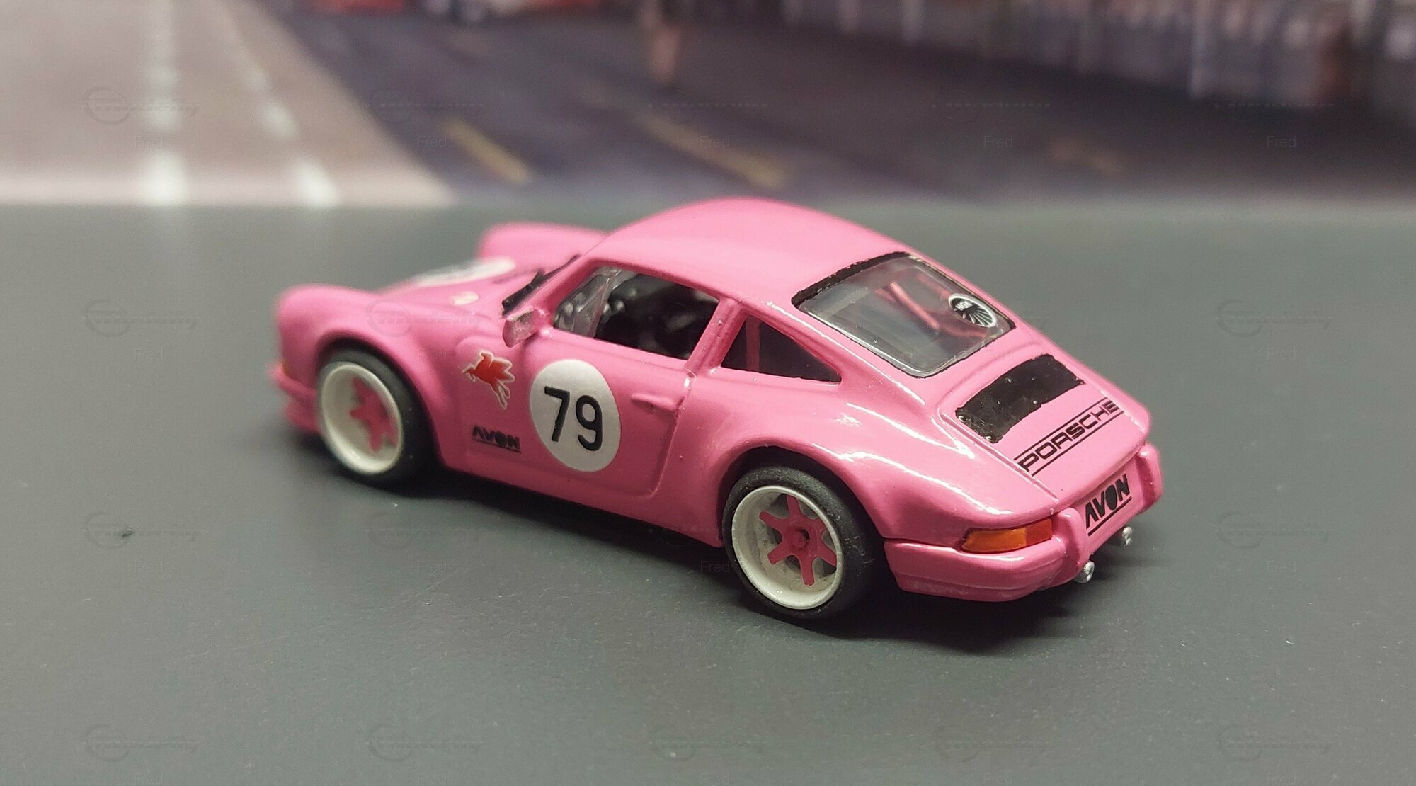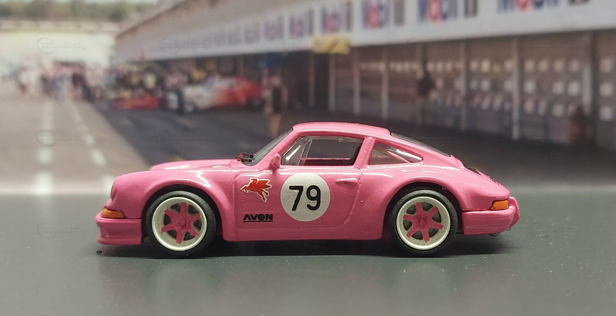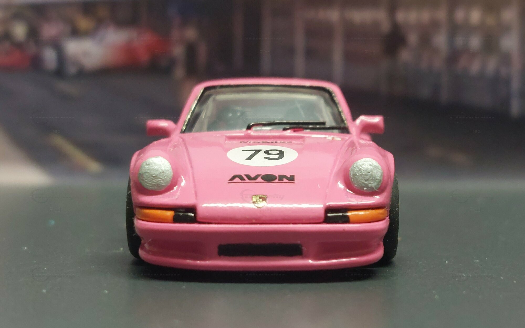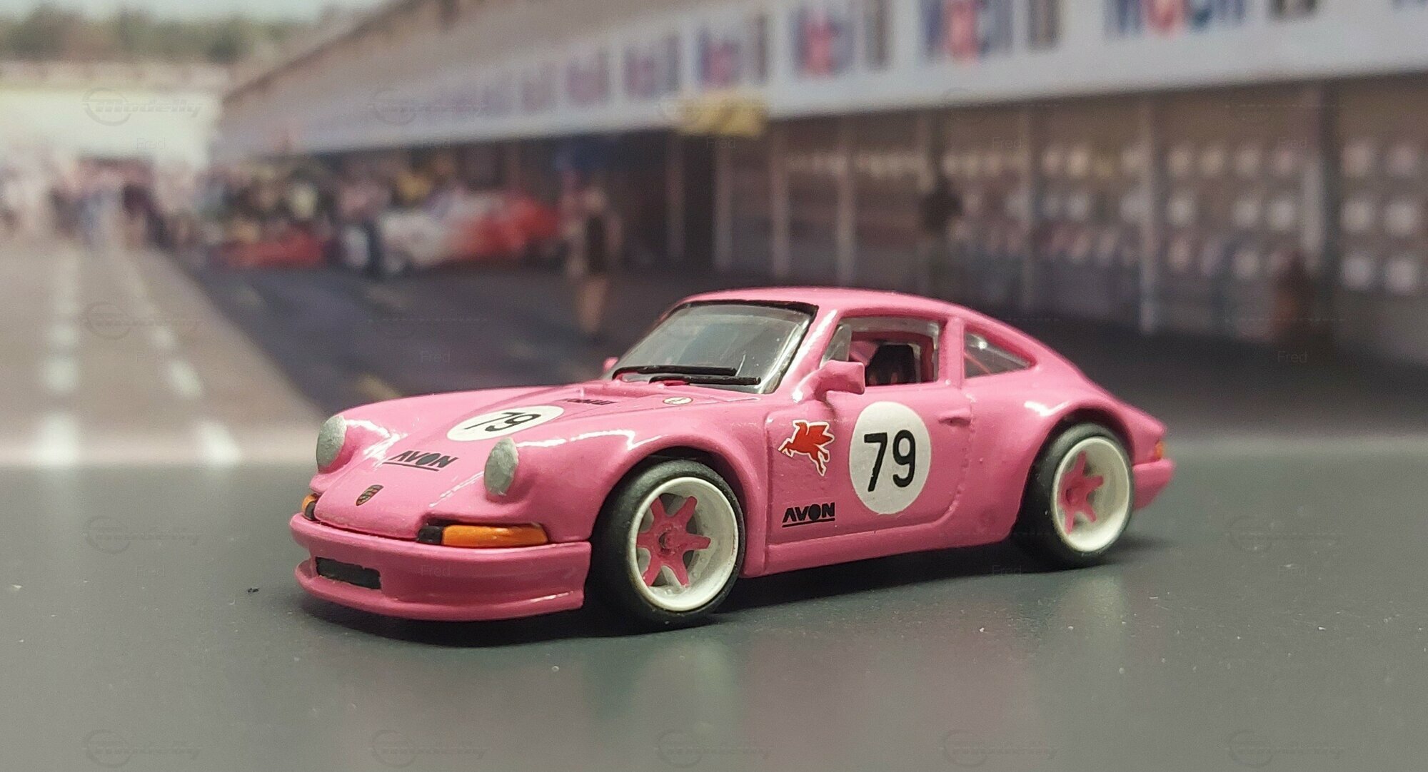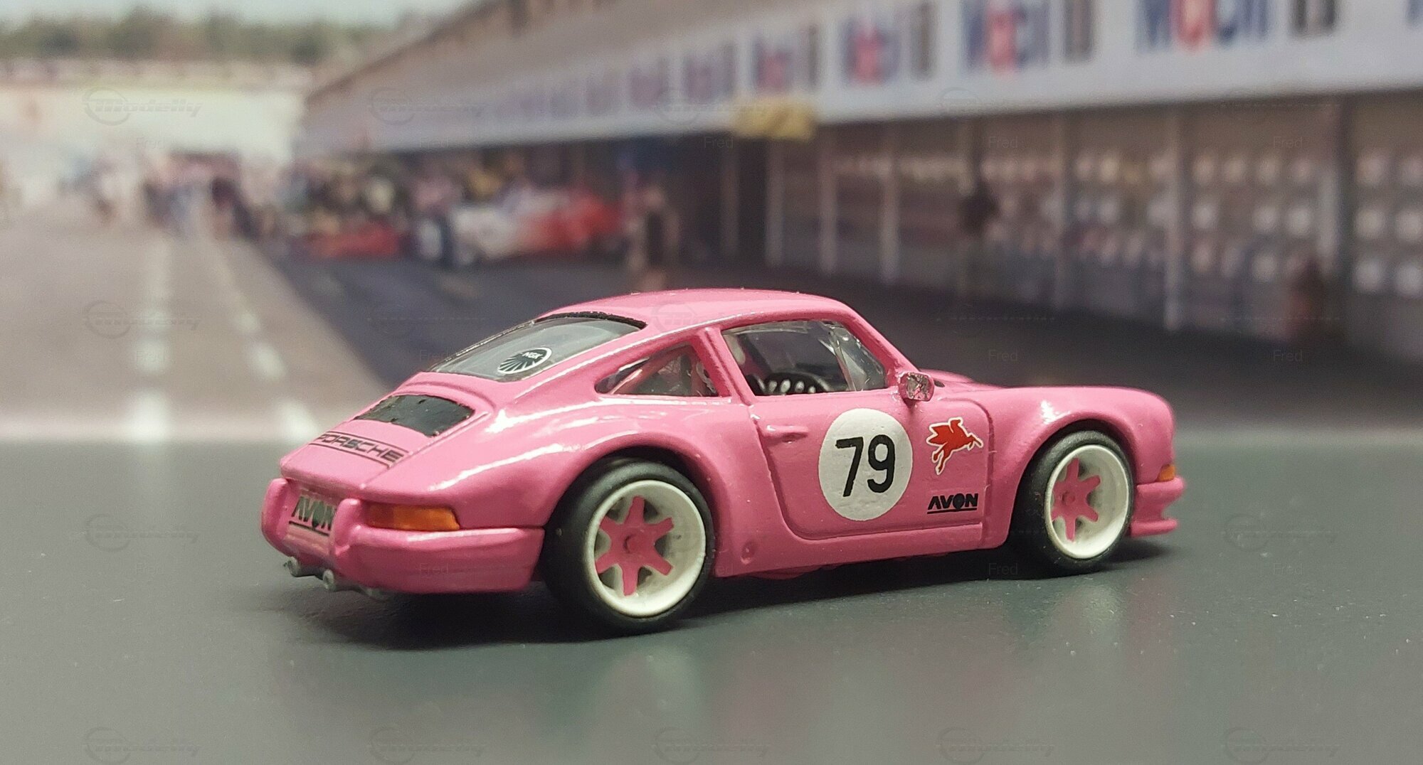 The 1/64 scale miniature shown here, manufactured by Hot Wheels, is an excellent example of fine scale modeling. Based on the original Porsche 911, this miniature is made of diecast material known for its durability and detail accuracy. This specific version of the model has been modified by Modelly member "Fred." It is important to note that the modifications do not correspond to the original production by Hot Wheels. The photos clearly show that the model features a striking pink paint scheme dominated by prominent motorsport details like the "AVON" lettering and the race number "79."