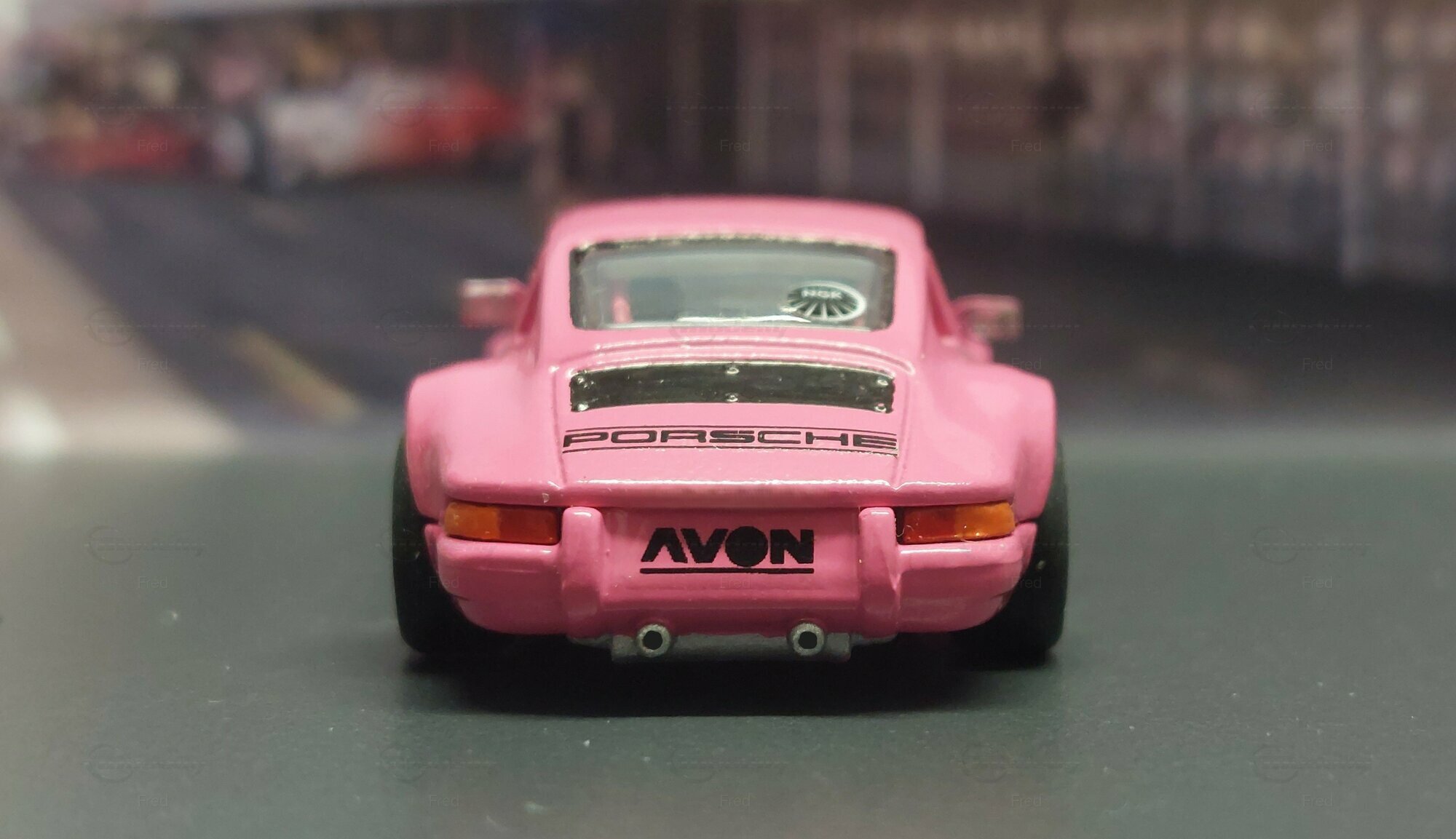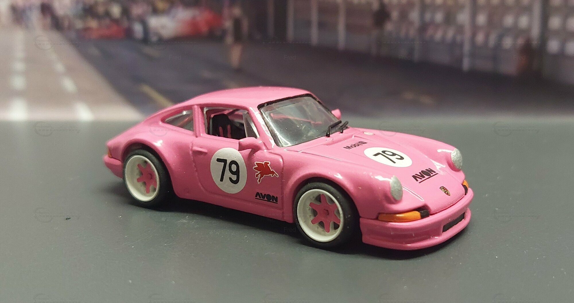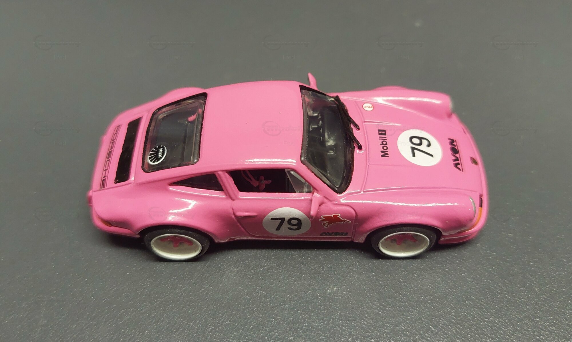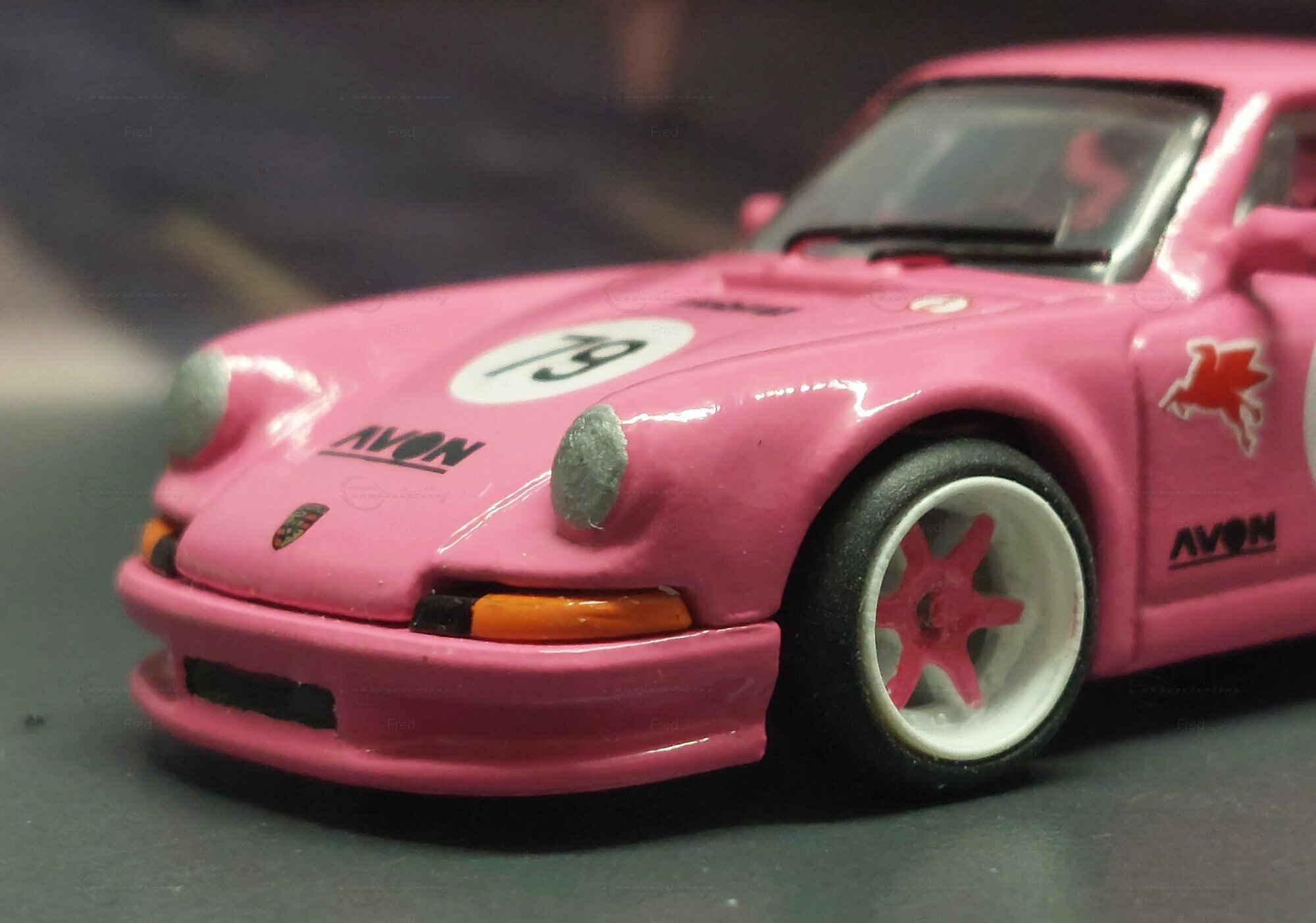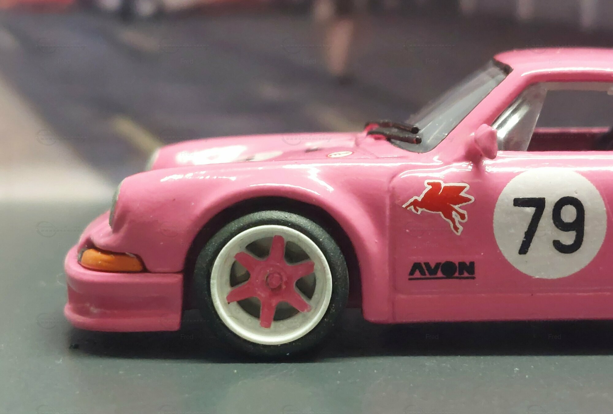 The 1/64 scale miniature shown here, manufactured by Hot Wheels, is an excellent example of fine scale modeling. Based on the original Porsche 911, this miniature is made of diecast material known for its durability and detail accuracy. This specific version of the model has been modified by Modelly member "Fred." It is important to note that the modifications do not correspond to the original production by Hot Wheels. The photos clearly show that the model features a striking pink paint scheme dominated by prominent motorsport details like the "AVON" lettering and the race number "79."