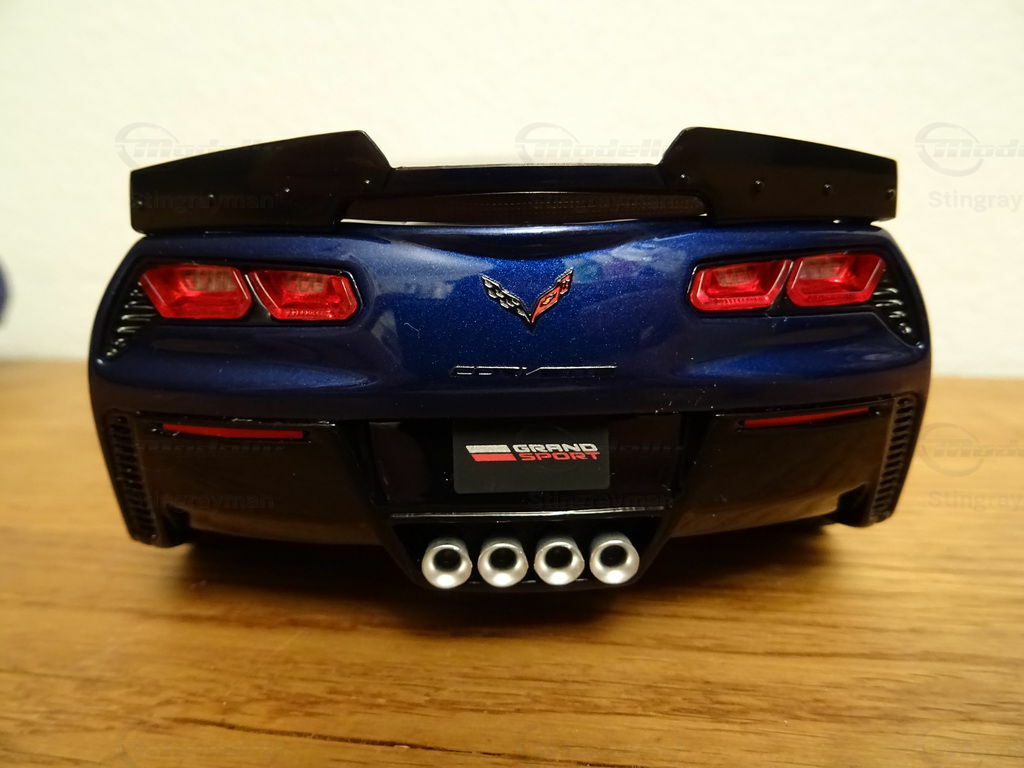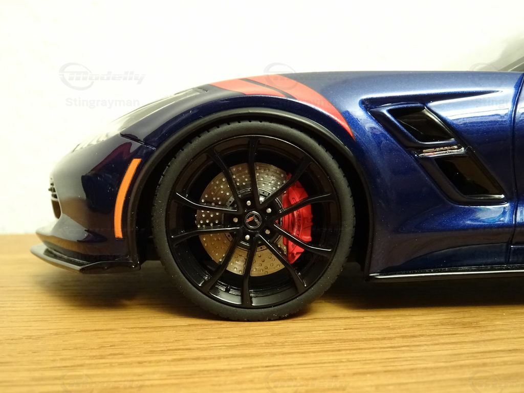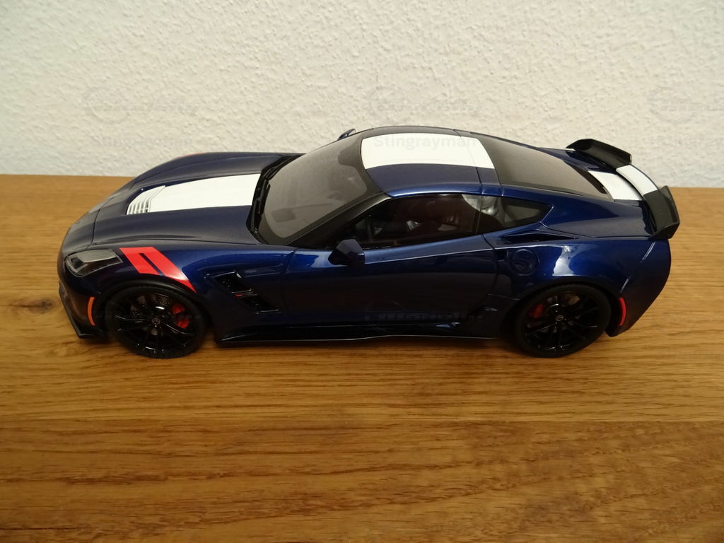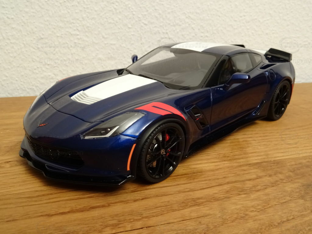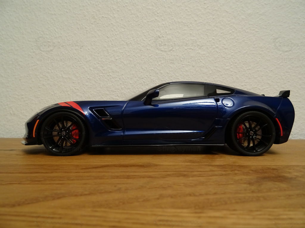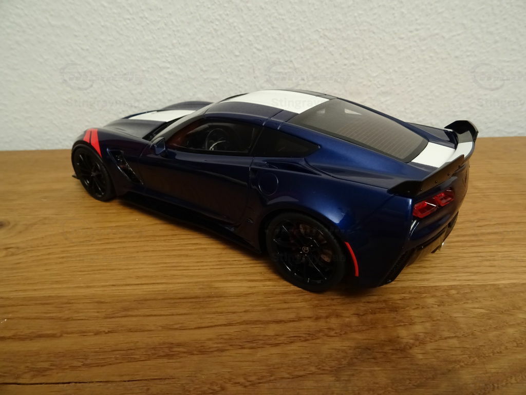 The model of the Chevrolet Corvette C7 Grand Sport in 1/18 scale, manufactured by ACME / GT Spirit, is a remarkable replica of the real vehicle. Made of high-quality resin, this miniature stands out for its excellent details and precision. The model, part of the collection of model car enthusiast "Stingrayman," presents itself in a deep blue color with white racing stripes running over the hood, skillfully capturing the sporty character of the original. Special features of the model include the red painted air vents on the front fenders and the stylized wheels that reflect the aggressive design of the Grand Sport. This exclusive model is a must-have for any collector who prefers realistic and detailed reproductions.